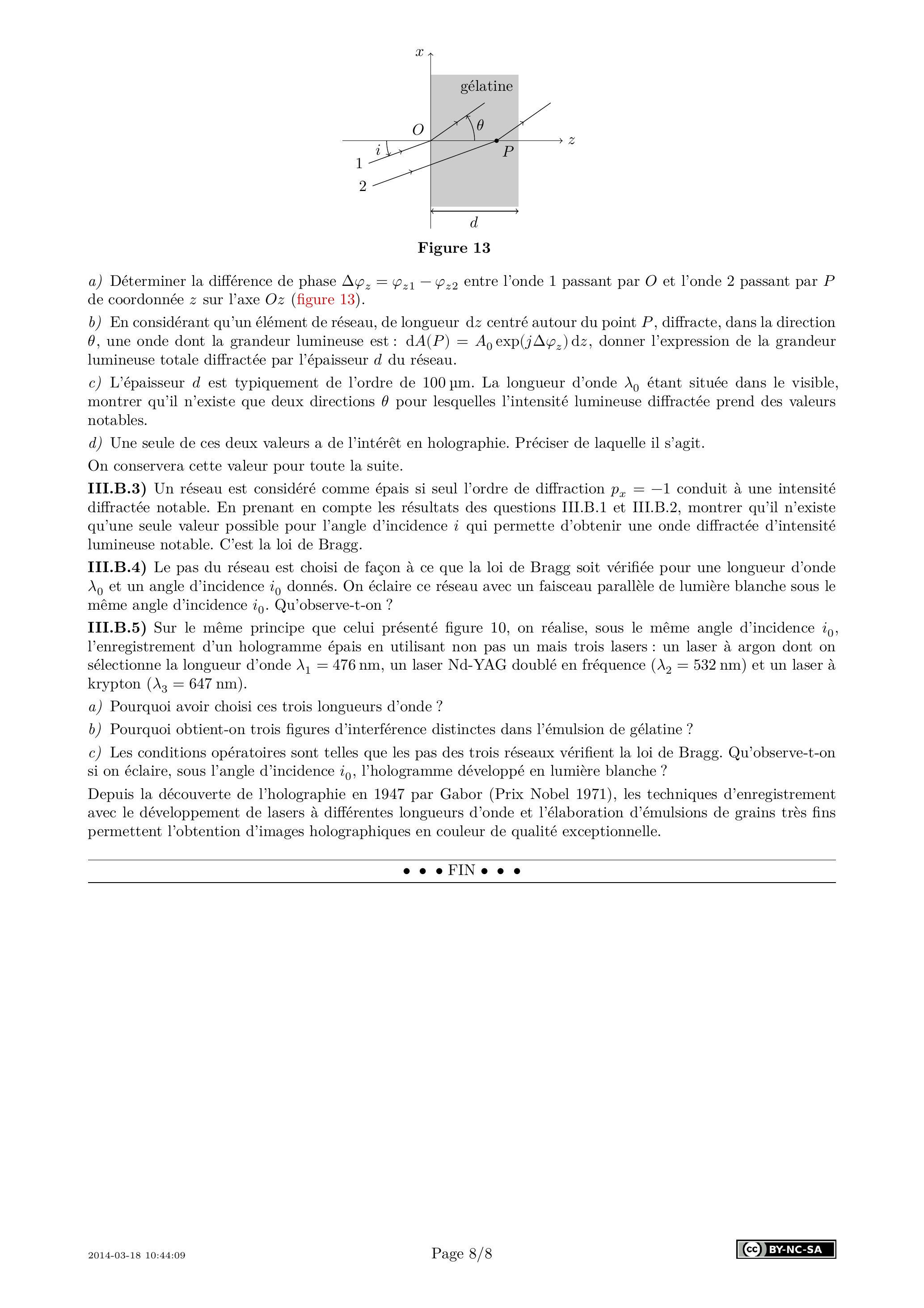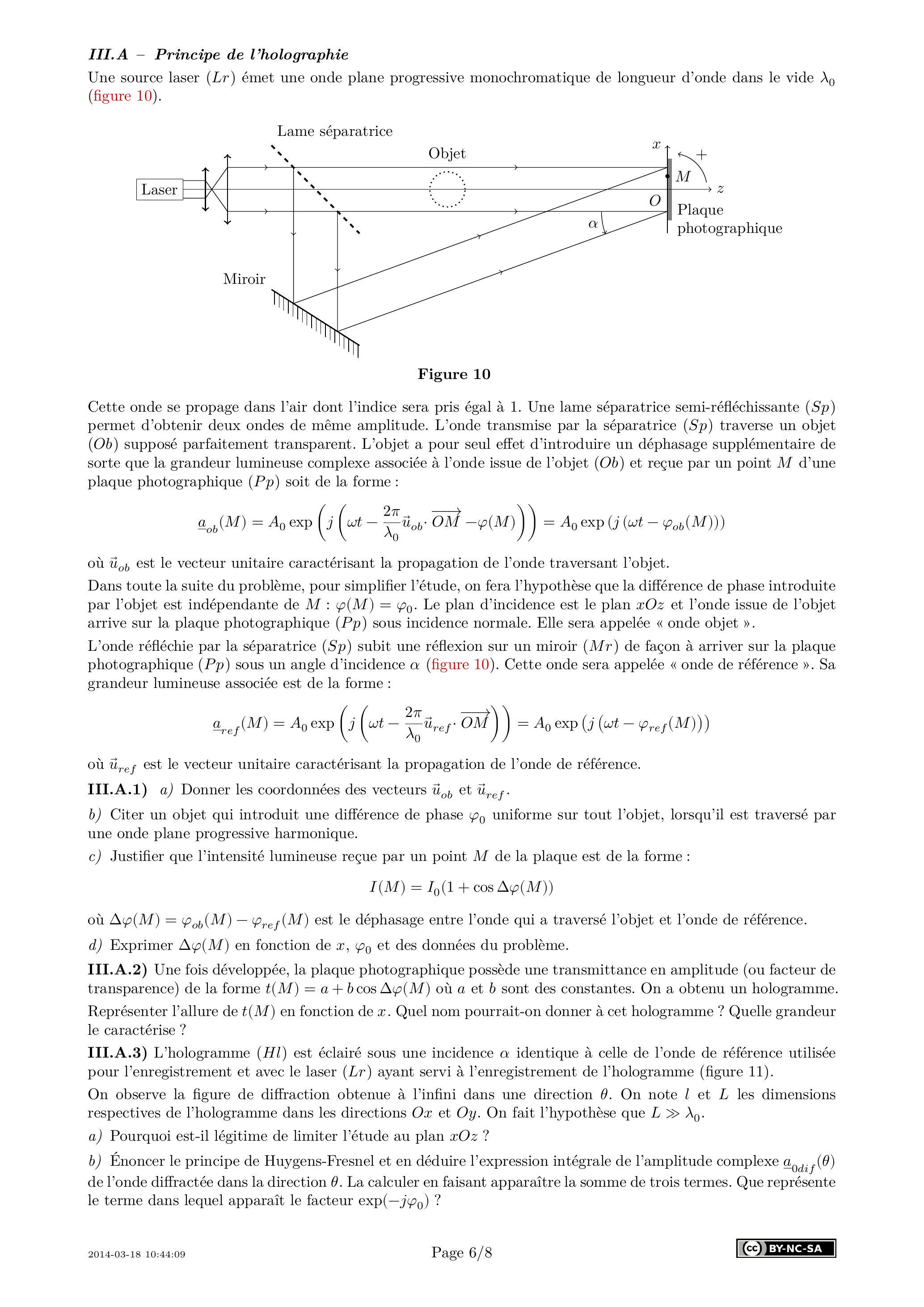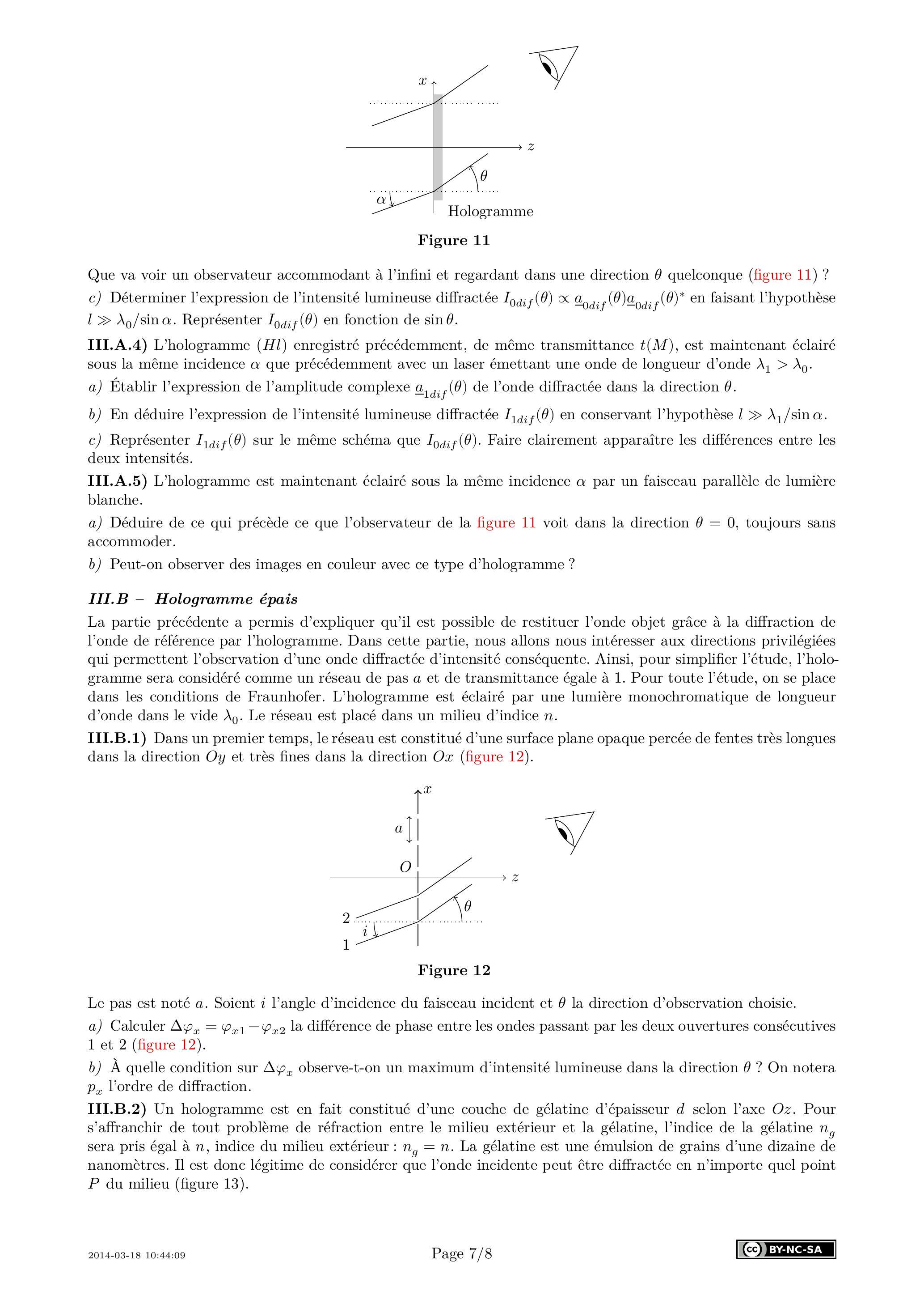 Dans toute la suite du problème, pour simplifier l'étude, on fera l'hypothèse que la différence de phase introduite par l'objet est indépendante de . Le plan d'incidence est le plan et l'onde issue de l'objet arrive sur la plaque photographique ( ) sous incidence normale. Elle sera appelée «onde objet ».