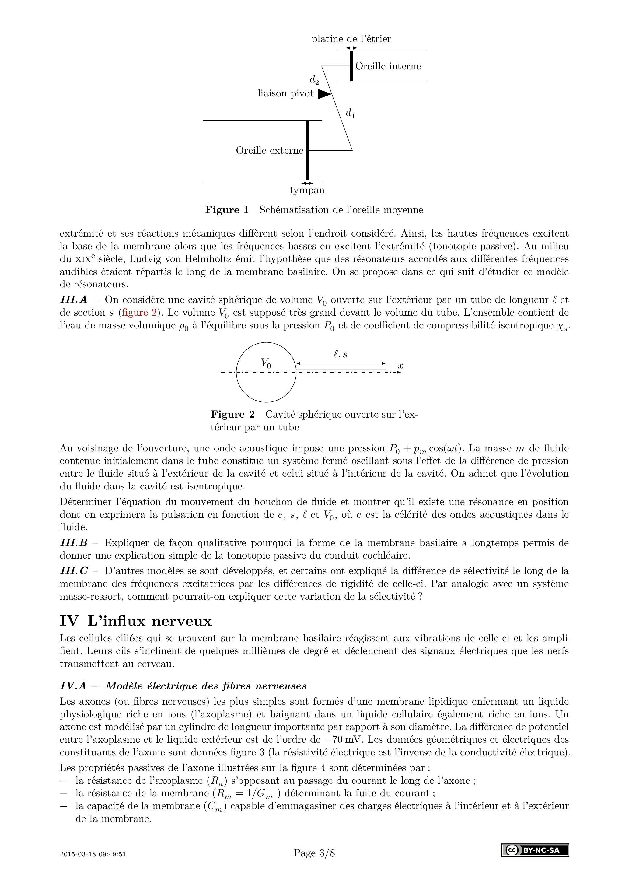 extrémité et ses réactions mécaniques diffèrent selon l'endroit considéré. Ainsi, les hautes fréquences excitent la base de la membrane alors que les fréquences basses en excitent l'extrémité (tonotopie passive). Au milieu du XIX siècle, Ludvig von Helmholtz émit l'hypothèse que des résonateurs accordés aux différentes fréquences audibles étaient répartis le long de la membrane basilaire. On se propose dans ce qui suit d'étudier ce modèle de résonateurs.