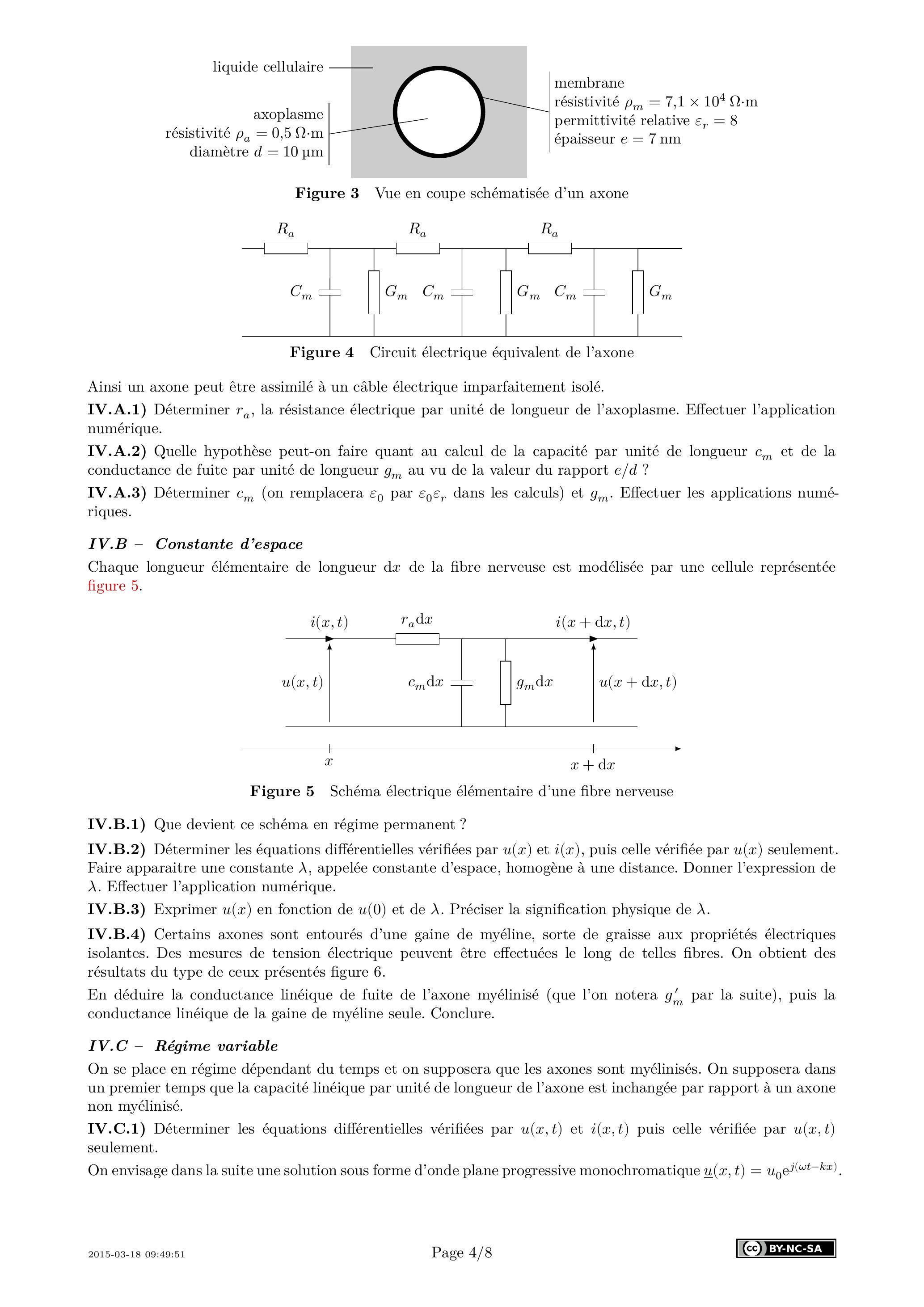 Les axones (ou fibres nerveuses) les plus simples sont formés d'une membrane lipidique enfermant un liquide physiologique riche en ions (l'axoplasme) et baignant dans un liquide cellulaire également riche en ions. Un axone est modélisé par un cylindre de longueur importante par rapport à son diamètre. La différence de potentiel entre l'axoplasme et le liquide extérieur est de l'ordre de -70 mV . Les données géométriques et électriques des constituants de l'axone sont données figure 3 (la résistivité électrique est l'inverse de la conductivité électrique).
