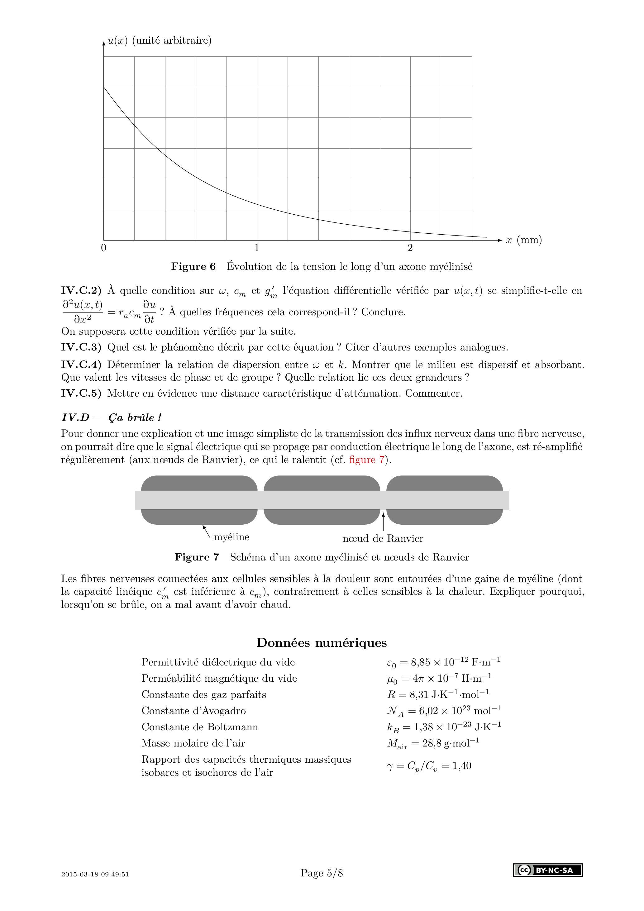 IV.B.4) Certains axones sont entourés d'une gaine de myéline, sorte de graisse aux propriétés électriques isolantes. Des mesures de tension électrique peuvent être effectuées le long de telles fibres. On obtient des résultats du type de ceux présentés figure 6.