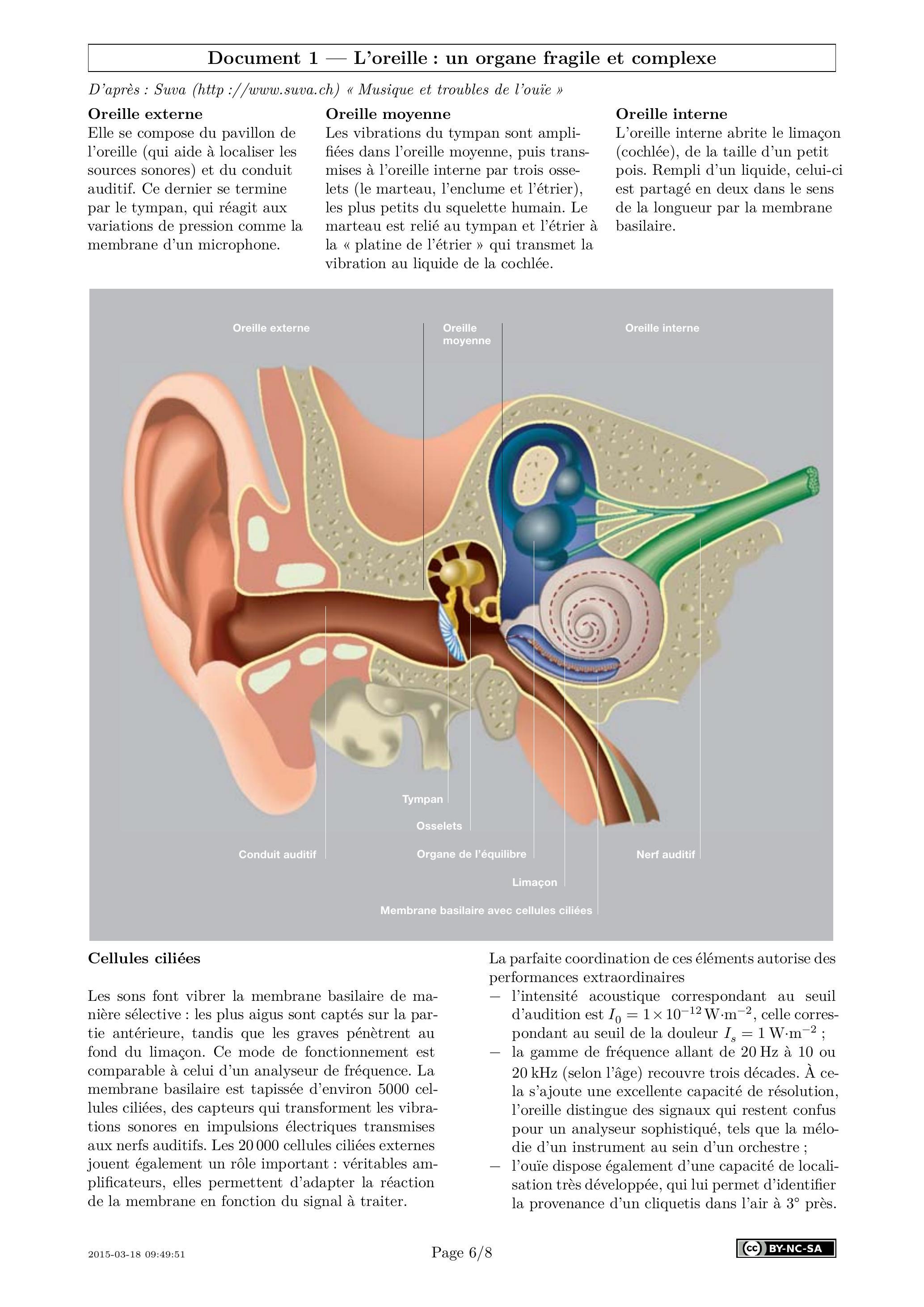 L'oreille se compose de trois parties : l'oreille externe, l'oreille moyenne et l'oreille interne. Les deux premières assurent le transfert des ondes sonores à l'oreille interne. L'oreille interne, ou cochlée, transforme ce stimulus en influx nerveux (cf. document 1).