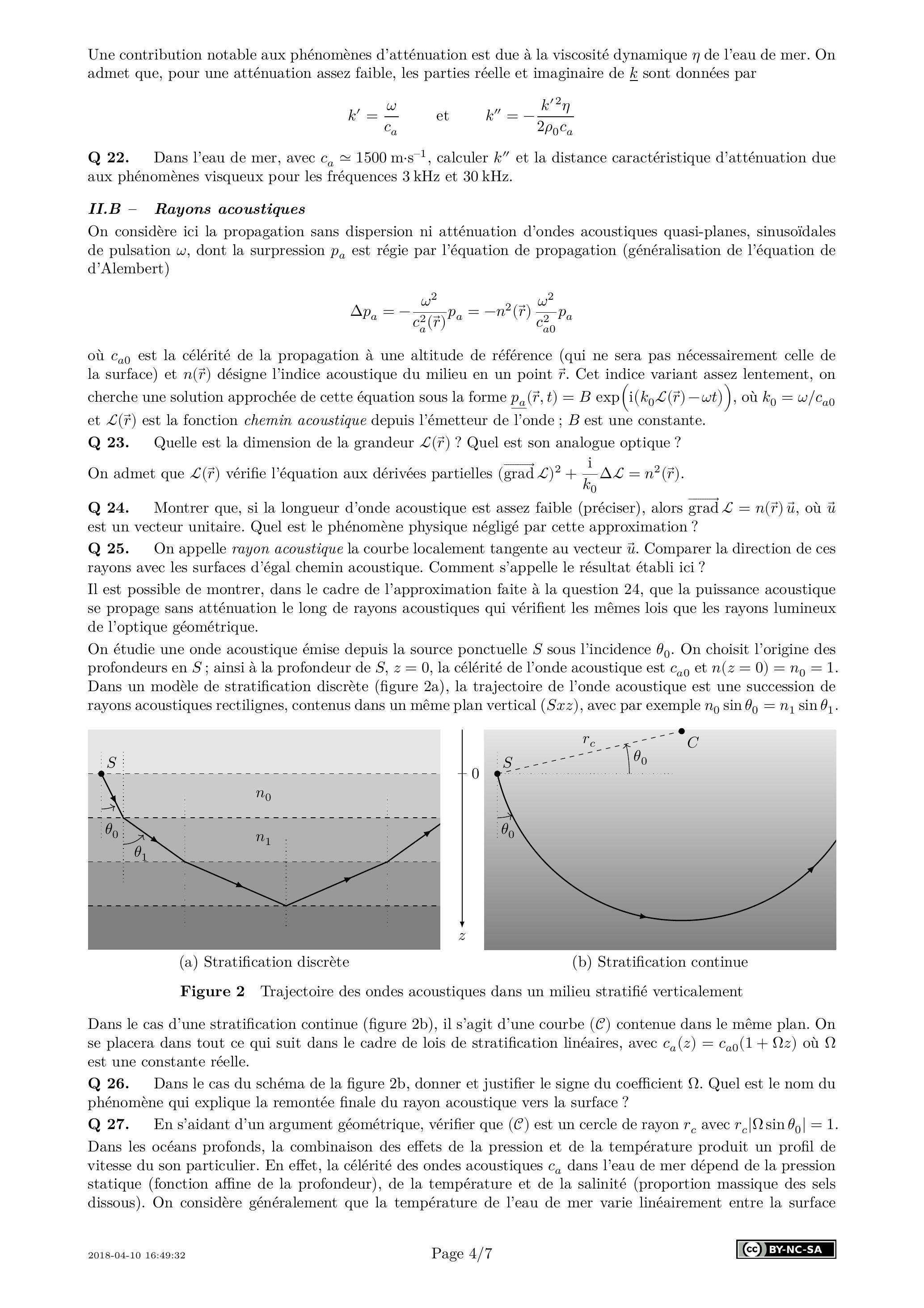 Q 26. Dans le cas du schéma de la figure 2b, donner et justifier le signe du coefficient . Quel est le nom du phénomène qui explique la remontée finale du rayon acoustique vers la surface ?