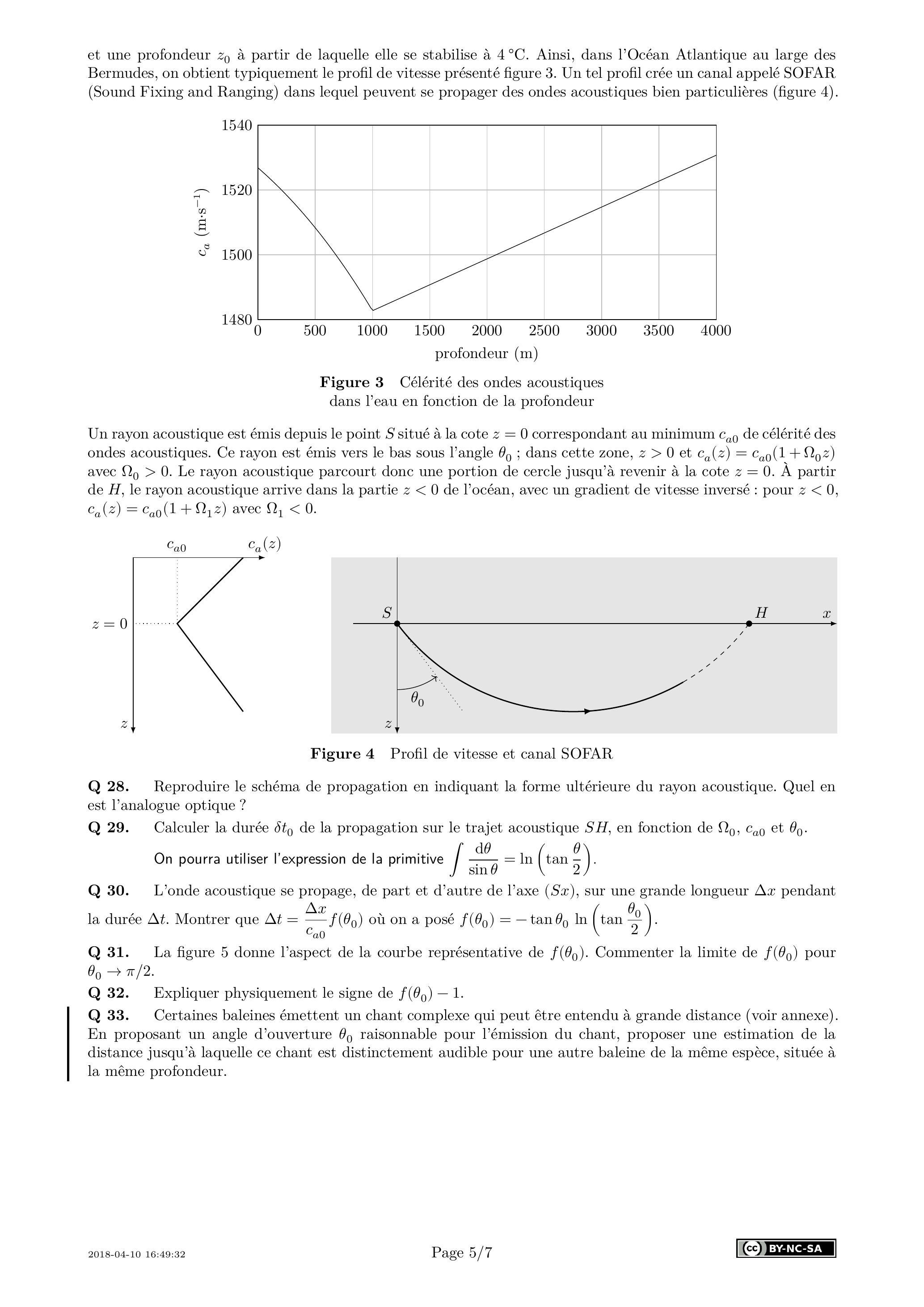 Q 27. En s'aidant d'un argument géométrique, vérifier que ( ) est un cercle de rayon avec . Dans les océans profonds, la combinaison des effets de la pression et de la température produit un profil de vitesse du son particulier. En effet, la célérité des ondes acoustiques dans l'eau de mer dépend de la pression statique (fonction affine de la profondeur), de la température et de la salinité (proportion massique des sels dissous). On considère généralement que la température de l'eau de mer varie linéairement entre la surface