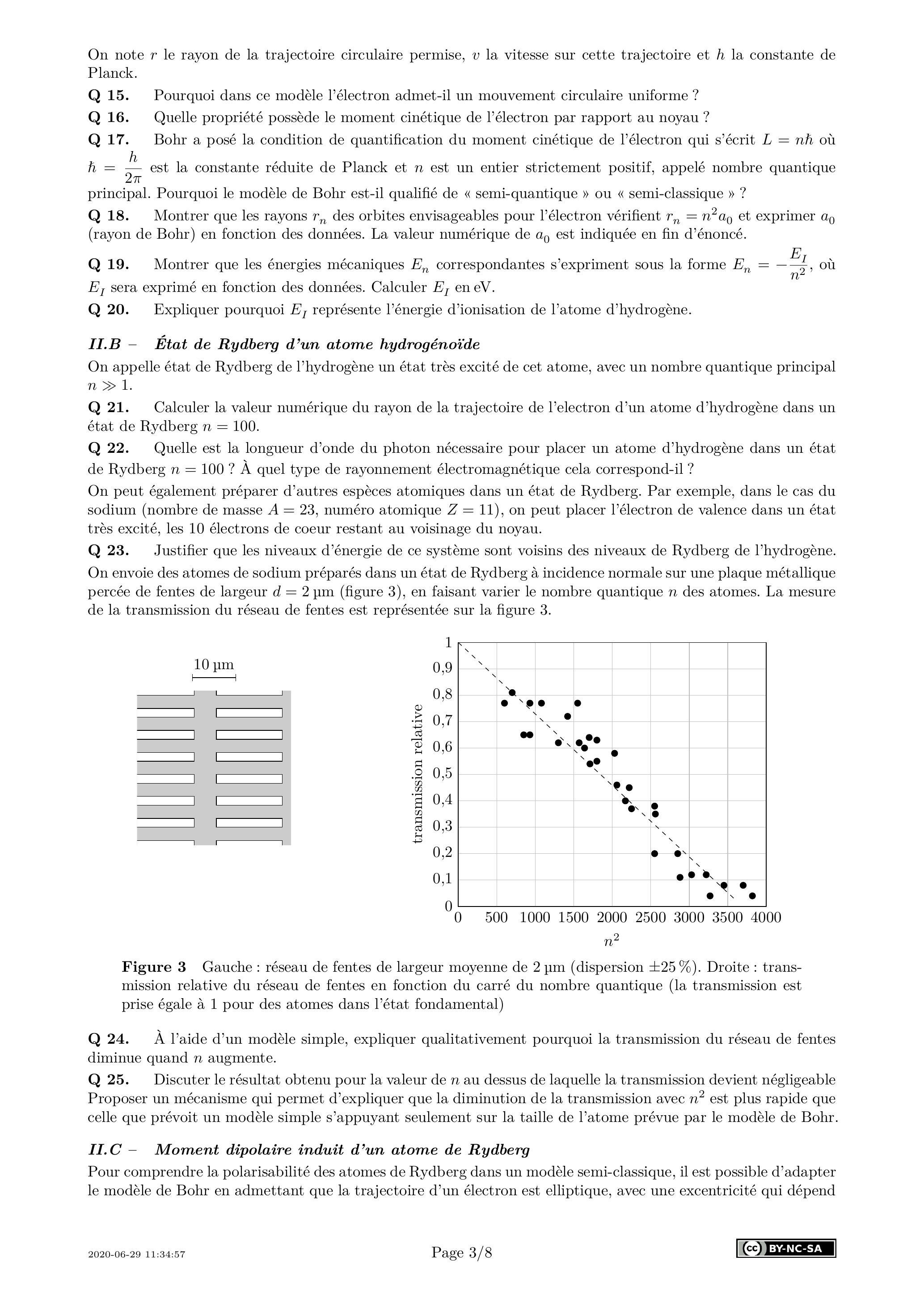 Q 23. Justifier que les niveaux d'énergie de ce système sont voisins des niveaux de Rydberg de l'hydrogène. On envoie des atomes de sodium préparés dans un état de Rydberg à incidence normale sur une plaque métallique percée de fentes de largeur (figure 3), en faisant varier le nombre quantique des atomes. La mesure de la transmission du réseau de fentes est représentée sur la figure 3.