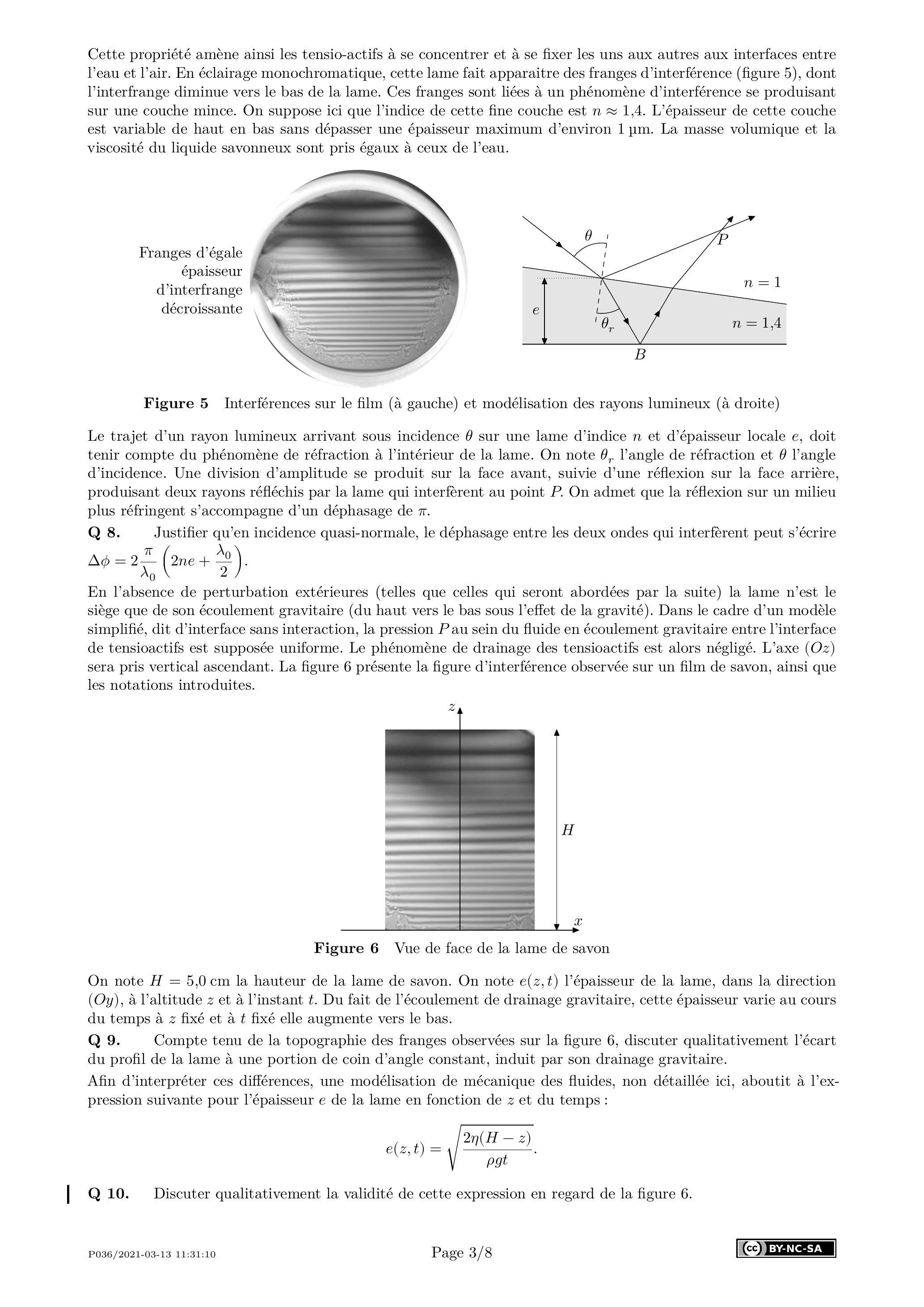 Cette propriété amène ainsi les tensio-actifs à se concentrer et à se fixer les uns aux autres aux interfaces entre l'eau et l'air. En éclairage monochromatique, cette lame fait apparaitre des franges d'interférence (figure 5), dont l'interfrange diminue vers le bas de la lame. Ces franges sont liées à un phénomène d'interférence se produisant sur une couche mince. On suppose ici que l'indice de cette fine couche est . L'épaisseur de cette couche est variable de haut en bas sans dépasser une épaisseur maximum d'environ . La masse volumique et la viscosité du liquide savonneux sont pris égaux à ceux de l'eau.