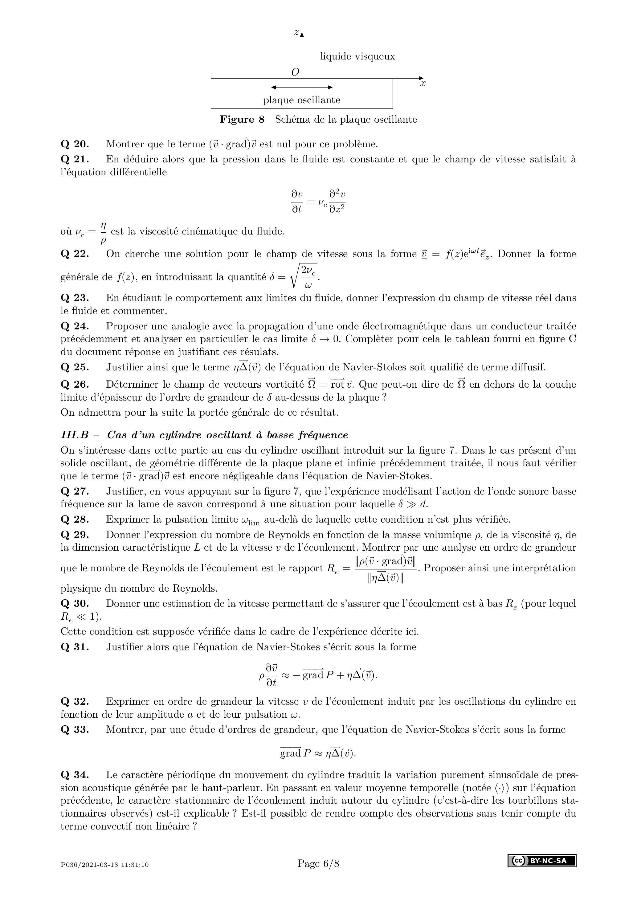 Q 32. Exprimer en ordre de grandeur la vitesse de l'écoulement induit par les oscillations du cylindre en fonction de leur amplitude et de leur pulsation .
