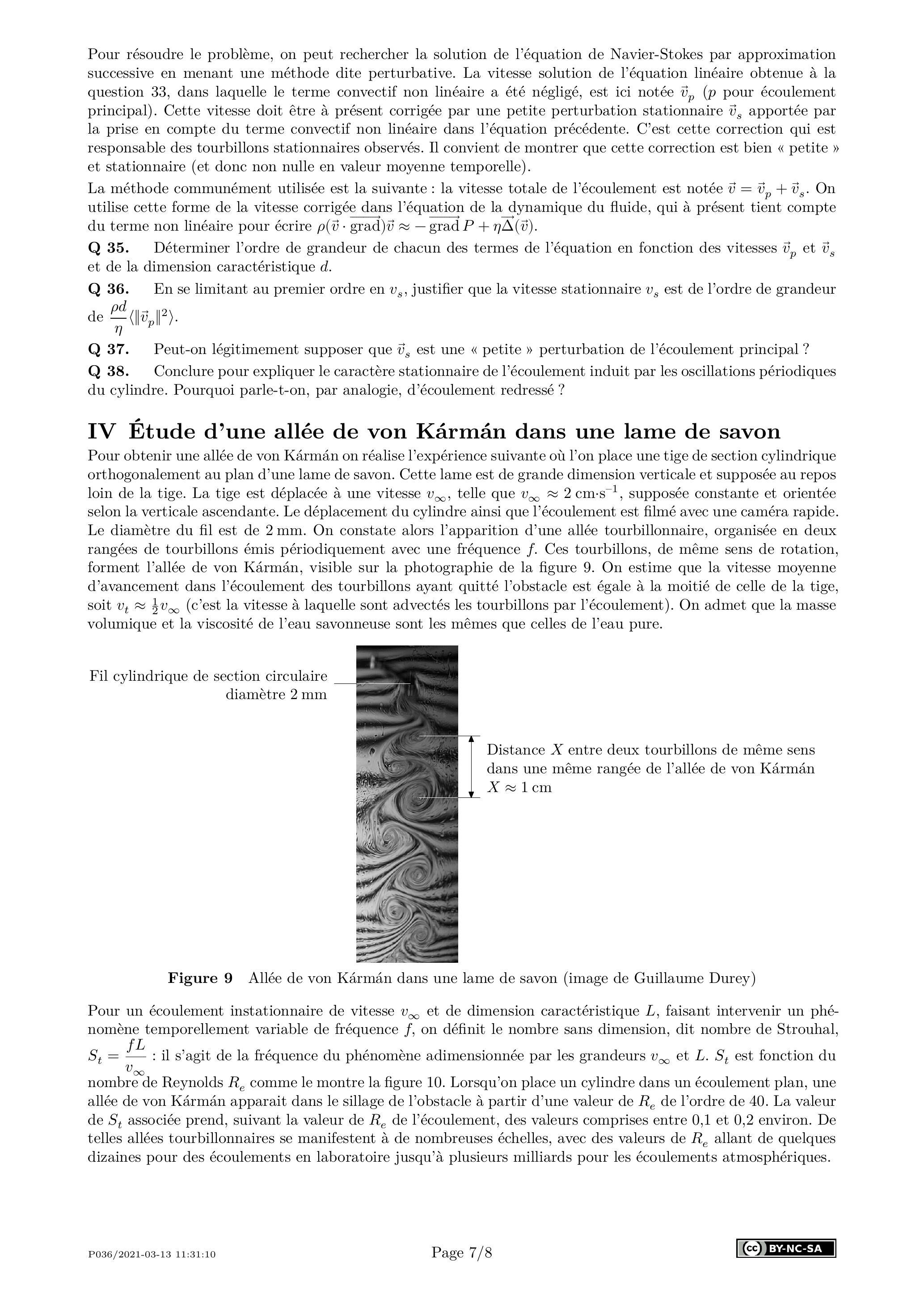 Pour obtenir une allée de von Kármán on réalise l'expérience suivante où l'on place une tige de section cylindrique orthogonalement au plan d'une lame de savon. Cette lame est de grande dimension verticale et supposée au repos loin de la tige. La tige est déplacée à une vitesse , telle que , supposée constante et orientée selon la verticale ascendante. Le déplacement du cylindre ainsi que l'écoulement est filmé avec une caméra rapide. Le diamètre du fil est de 2 mm . On constate alors l'apparition d'une allée tourbillonnaire, organisée en deux rangées de tourbillons émis périodiquement avec une fréquence . Ces tourbillons, de même sens de rotation, forment l'allée de von Kármán, visible sur la photographie de la figure 9 . On estime que la vitesse moyenne d'avancement dans l'écoulement des tourbillons ayant quitté l'obstacle est égale à la moitié de celle de la tige, soit (c'est la vitesse à laquelle sont advectés les tourbillons par l'écoulement). On admet que la masse volumique et la viscosité de l'eau savonneuse sont les mêmes que celles de l'eau pure.