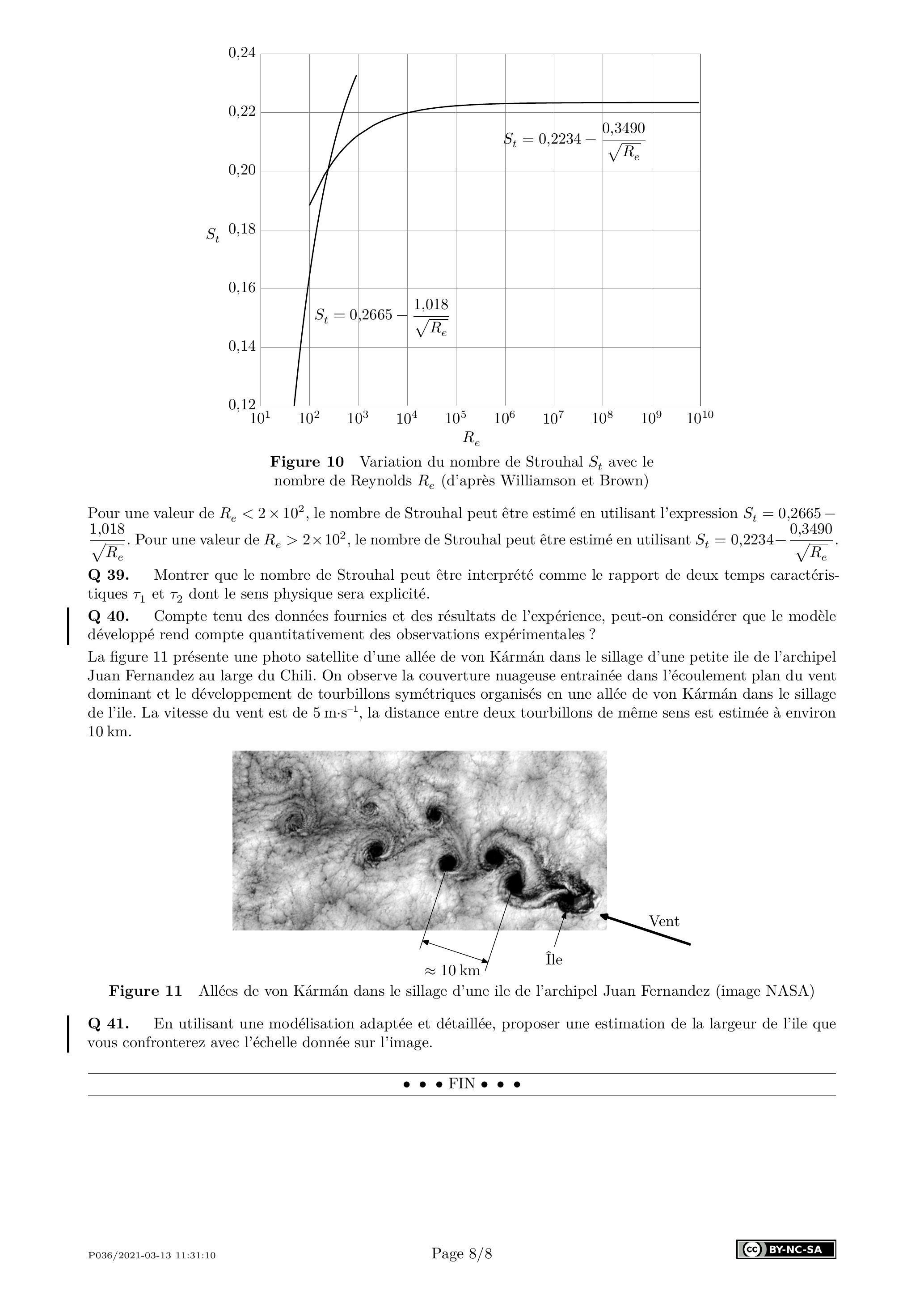 Pour une valeur de , le nombre de Strouhal peut être estimé en utilisant l'expression . Pour une valeur de , le nombre de Strouhal peut être estimé en utilisant . Q 39. Montrer que le nombre de Strouhal peut être interprété comme le rapport de deux temps caractéristiques et dont le sens physique sera explicité.