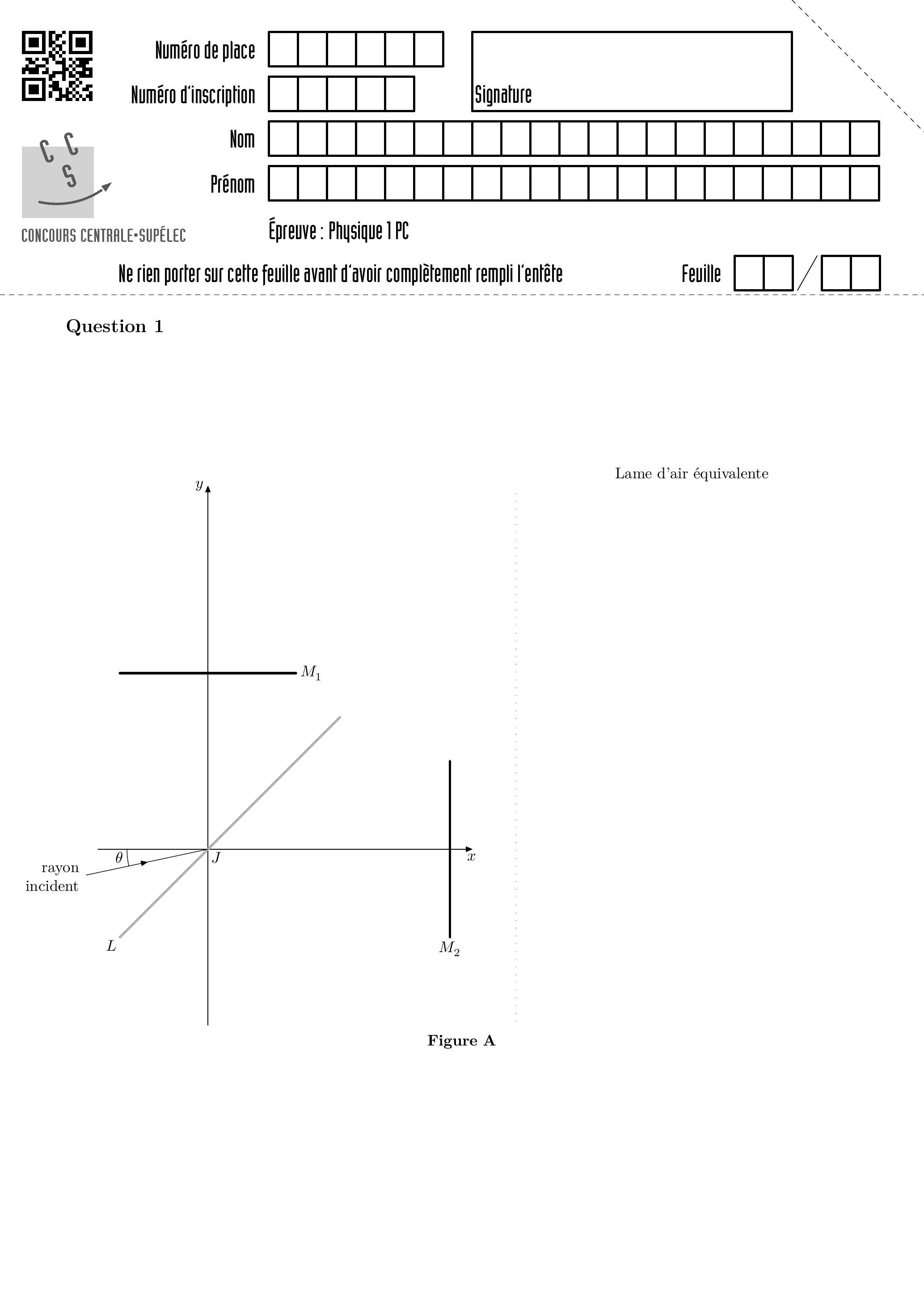 Q 1. Sur la figure A du document réponse, à rendre avec la copie, tracer avec soin les deux rayons issus du rayon incident qui émergent de l'interféromètre dans l'espace d'observation. Sur le même schéma, dans l'espace réservé à cet effet, montrer graphiquement que l'on peut considérer que ces deux rayons sont issus d'une «lame d'air » d'épaisseur que l'on représentera. On supposera que l'indice de l'air est égal à 1 .