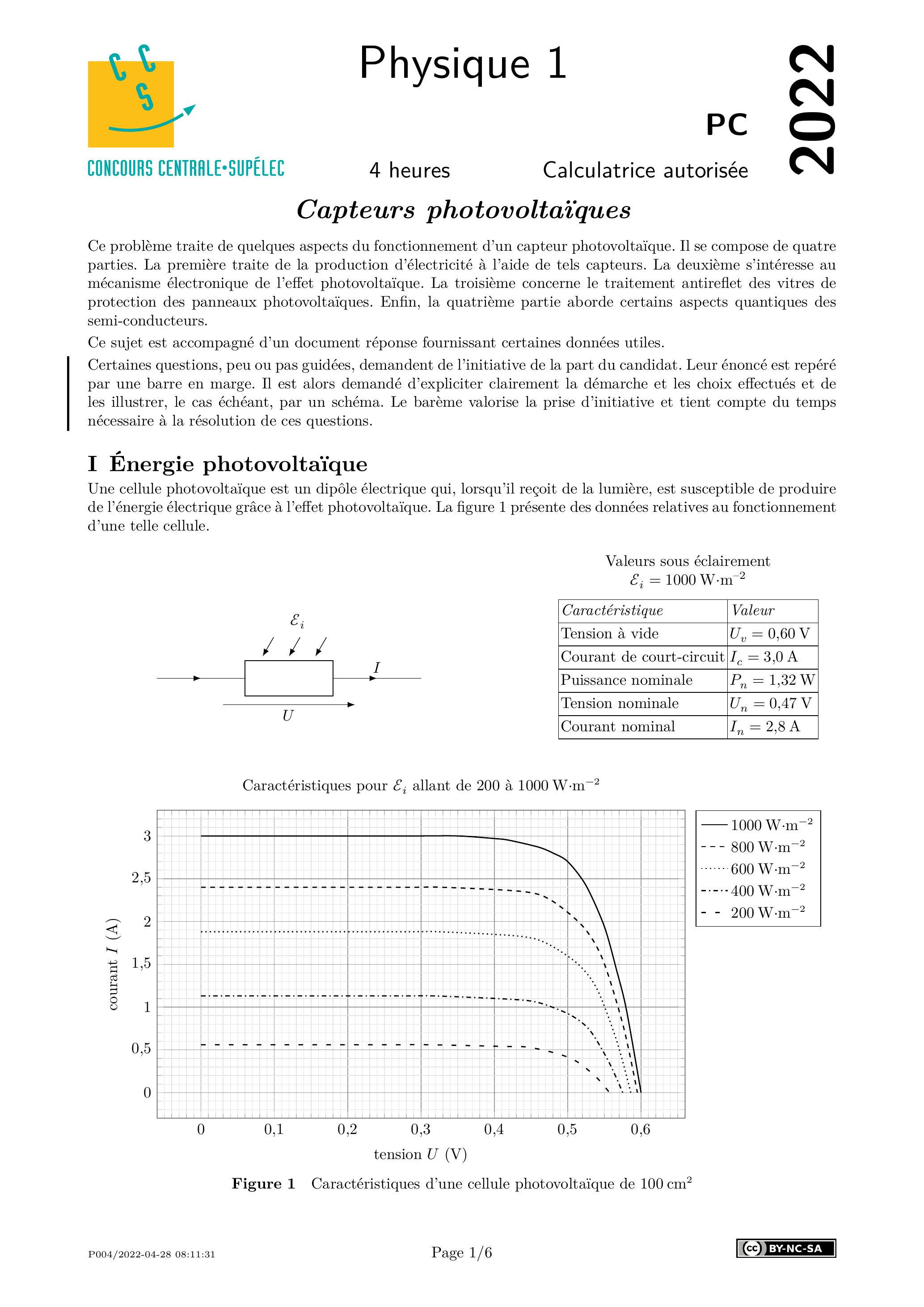 Ce problème traite de quelques aspects du fonctionnement d'un capteur photovoltaïque. Il se compose de quatre parties. La première traite de la production d'électricité à l'aide de tels capteurs. La deuxième s'intéresse au mécanisme électronique de l'effet photovoltaïque. La troisième concerne le traitement antireflet des vitres de protection des panneaux photovoltaïques. Enfin, la quatrième partie aborde certains aspects quantiques des semi-conducteurs.