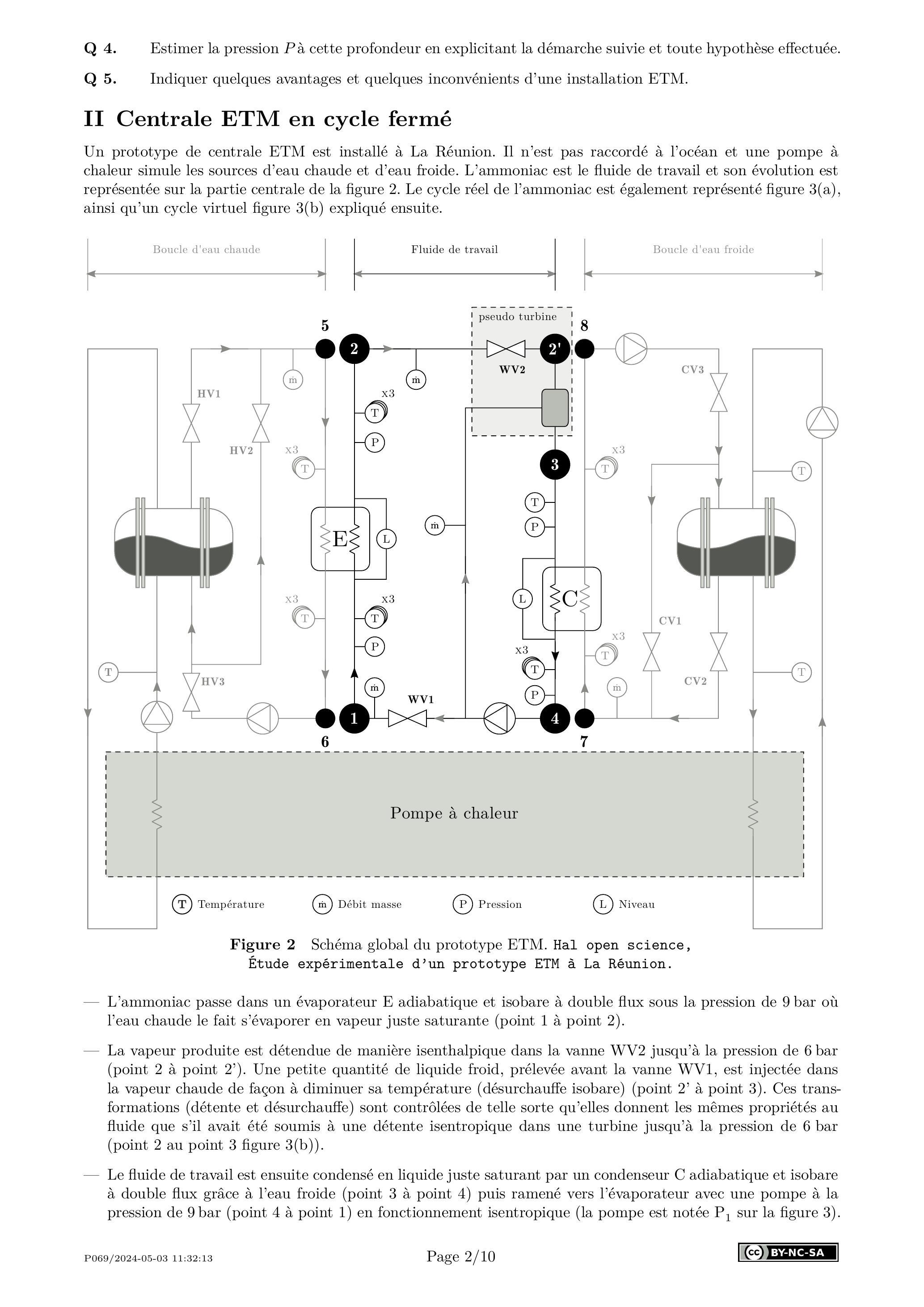 Un prototype de centrale ETM est installé à La Réunion. Il n'est pas raccordé à l'océan et une pompe à chaleur simule les sources d'eau chaude et d'eau froide. L'ammoniac est le fluide de travail et son évolution est représentée sur la partie centrale de la figure 2 . Le cycle réel de l'ammoniac est également représenté figure 3(a), ainsi qu'un cycle virtuel figure 3(b) expliqué ensuite.