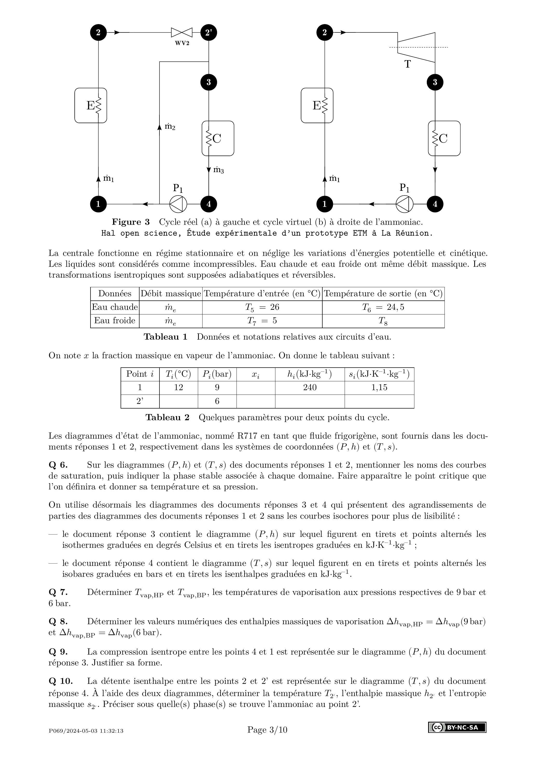 Q 12. Représenter sur les diagrammes et des documents réponses 3 et 4 le cycle effectué par l'ammoniac dans le dispositif ETM. On fera apparaître en particulier les points ', 3,4 et 1 ' (liquide juste saturant à 9 bar).