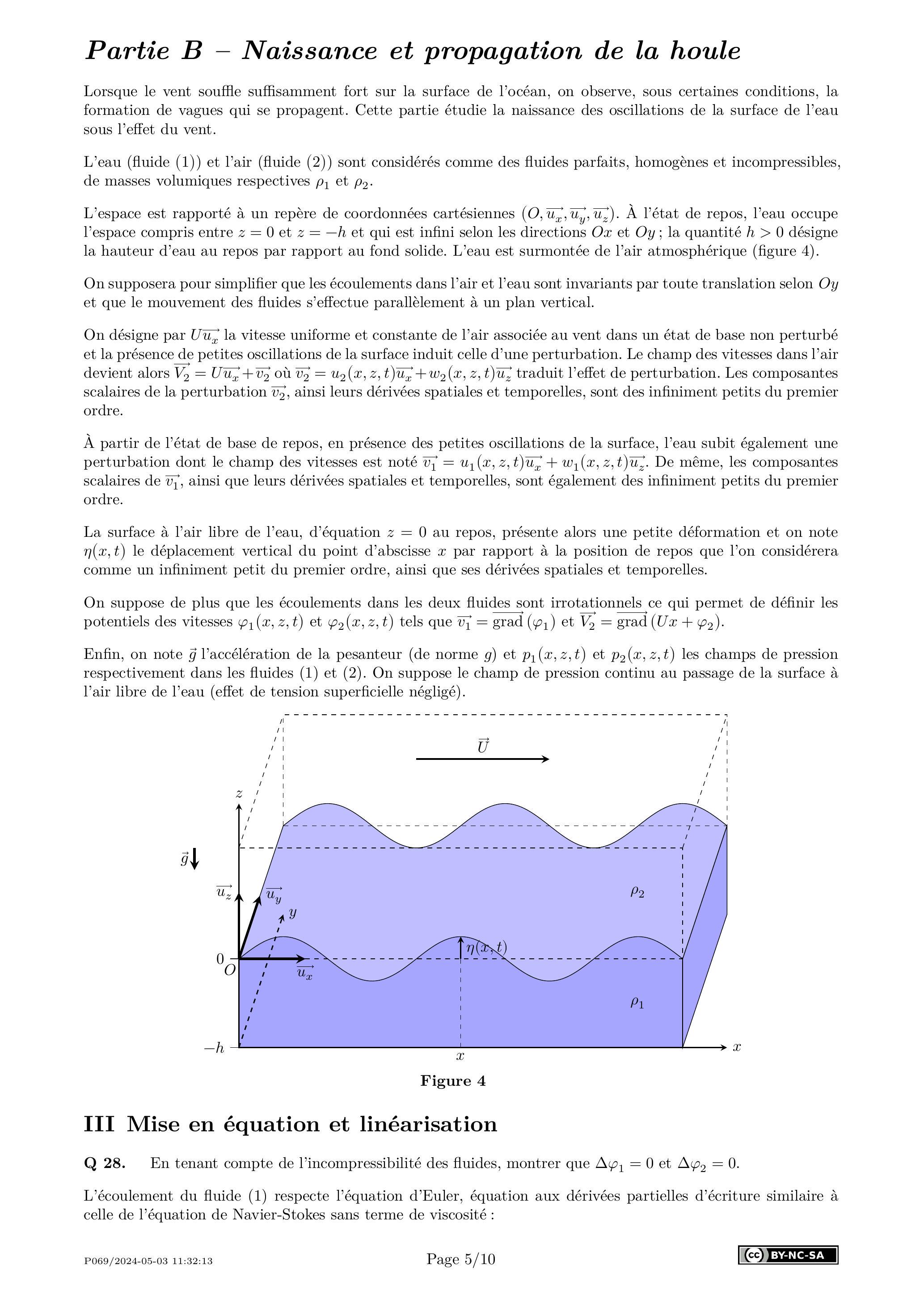 Q 30. De même, écrire l'équation d'Euler vérifiée par le champ des vitesses en tout point du fluide (2). Montrer que la linéarisation de cette équation, en ne conservant que les termes en vitesse d'ordres inférieurs ou égaux à 1 , conduit à l'égalité :