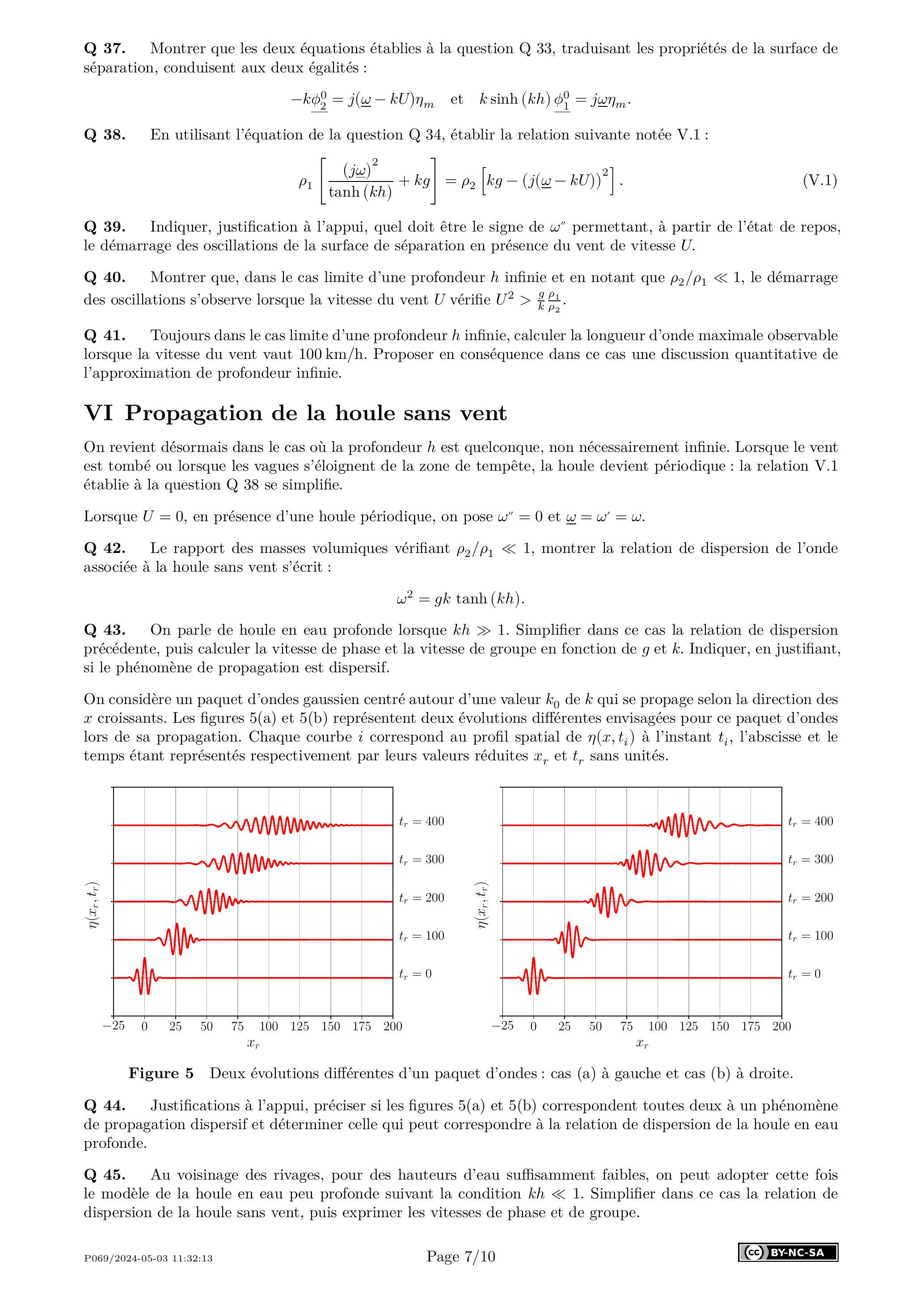 Q 39. Indiquer, justification à l'appui, quel doit être le signe de permettant, à partir de l'état de repos, le démarrage des oscillations de la surface de séparation en présence du vent de vitesse .