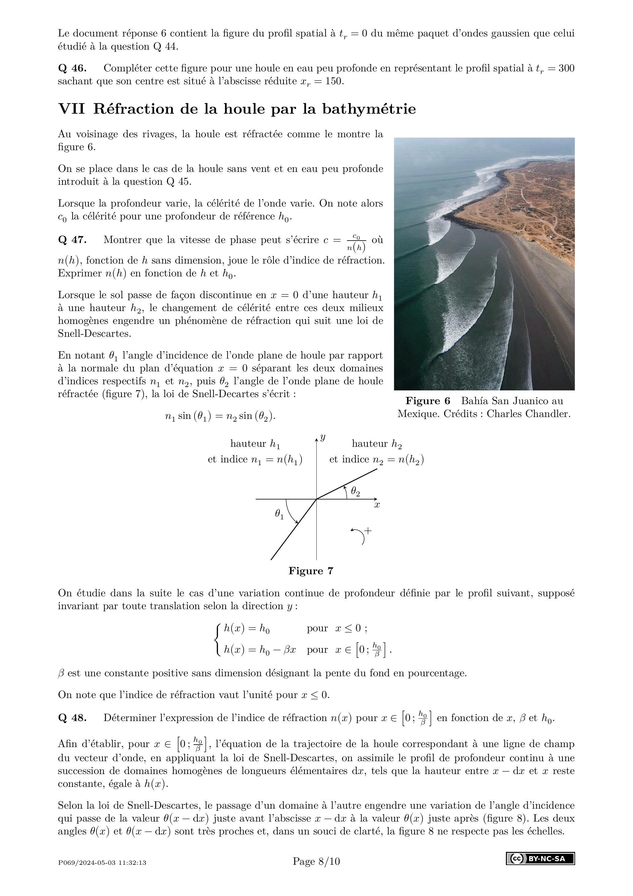 Q 52. Compléter soigneusement le document réponse 8 de sorte à y faire apparaître quelques courbes équiphases correspondant à la crête d'une vague pour divers instants. Commenter l'évolution de ces courbes équiphases au cours de l'approche du rivage en relation avec les courbes d'iso-profondeur (ou courbes isobathes), ainsi qu'avec la figure 6.