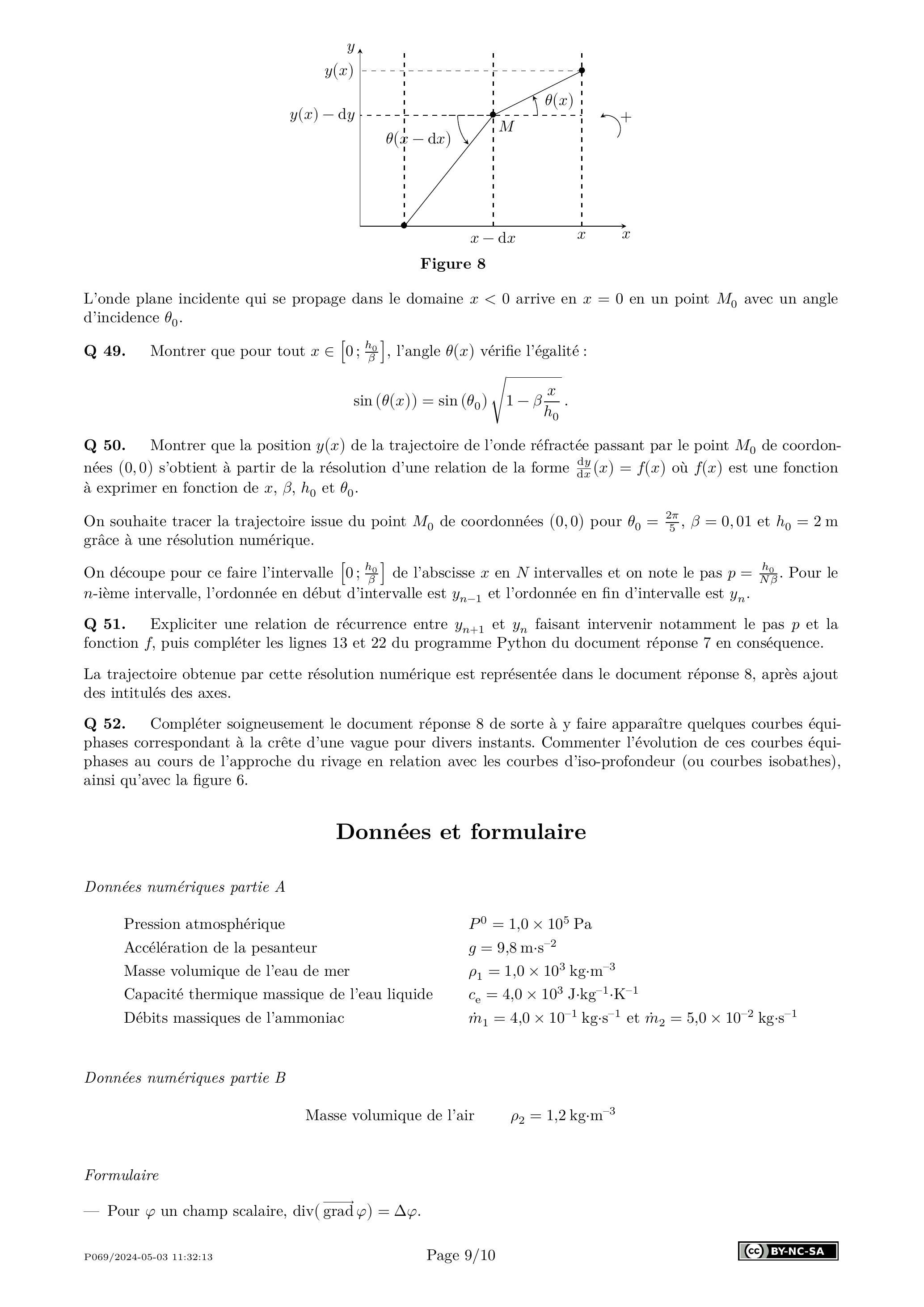 Q 50. Montrer que la position de la trajectoire de l'onde réfractée passant par le point de coordonnées s'obtient à partir de la résolution d'une relation de la forme où est une fonction à exprimer en fonction de et .