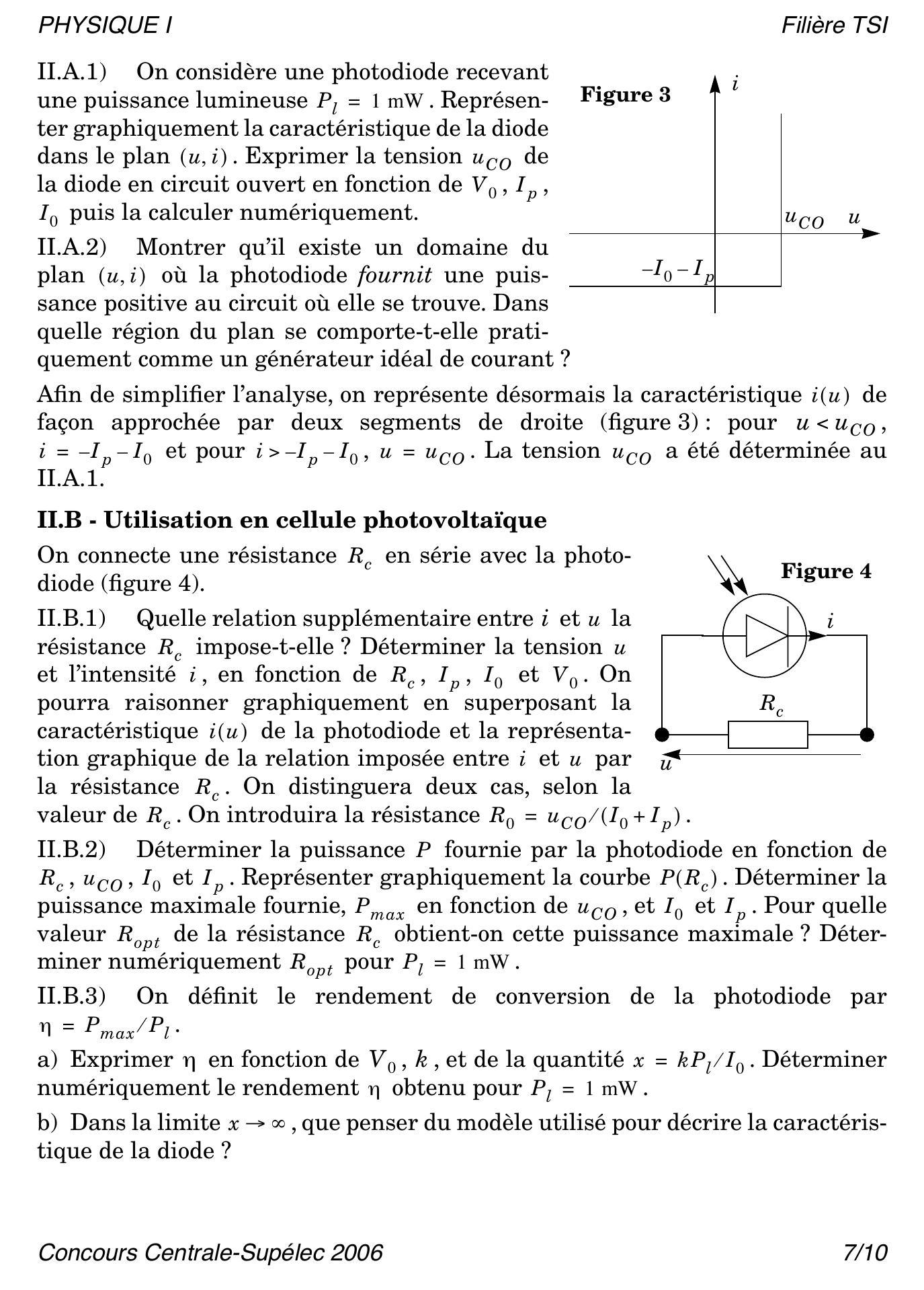 II.A.1) On considère une photodiode recevant une puissance lumineuse . Représenter graphiquement la caractéristique de la diode dans le plan . Exprimer la tension de la diode en circuit ouvert en fonction de , puis la calculer numériquement.