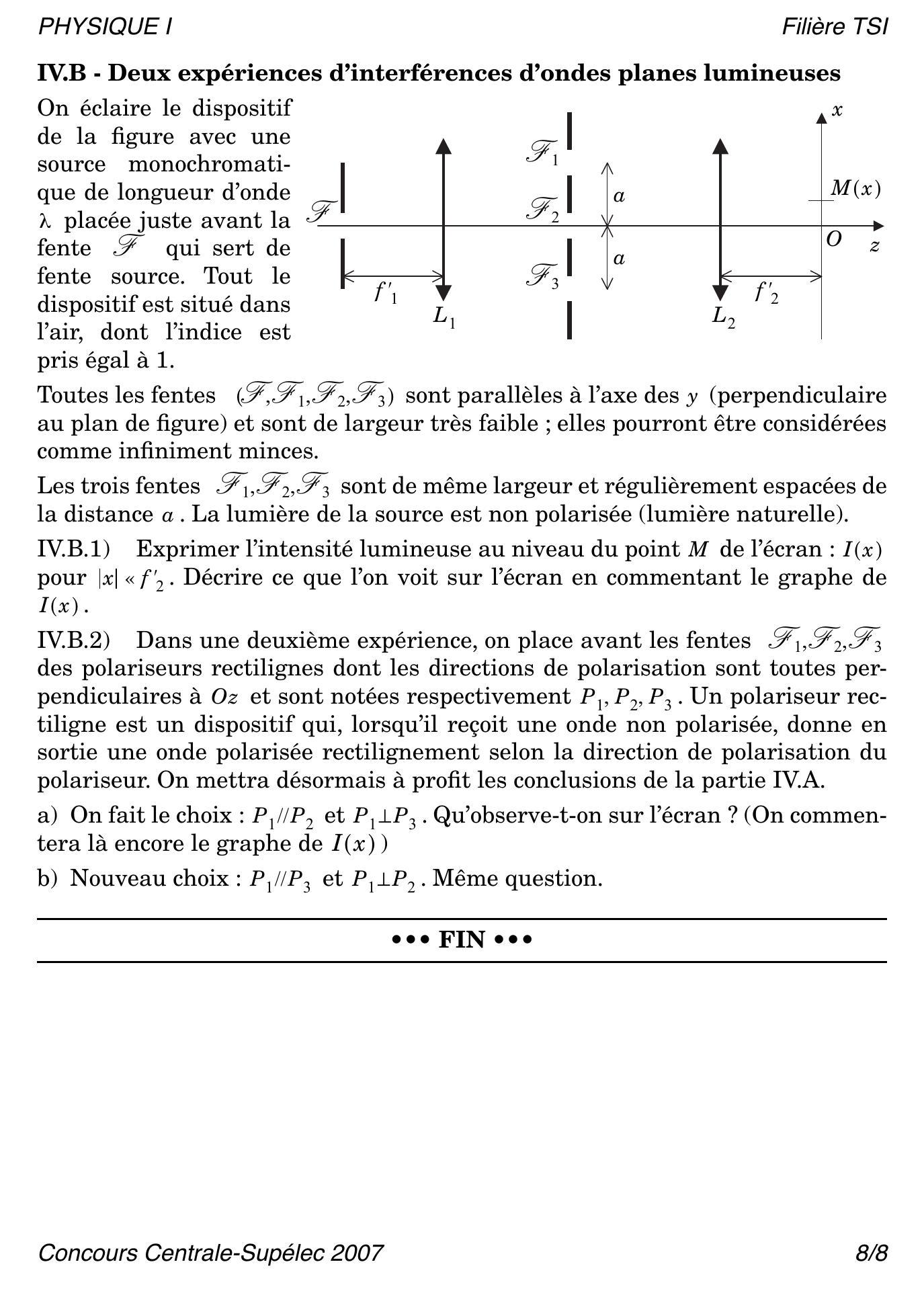Enfin, une quatrième partie, appuyée sur la nature électromagnétique des ondes lumineuses, utilise les propriétés des ondes électromagnétiques et propose une application à une expérience d'interférences.