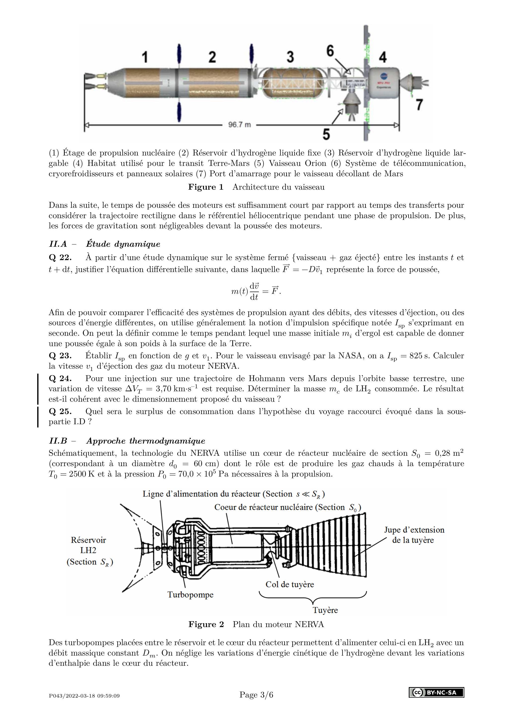 Q 23. Établir en fonction de et . Pour le vaisseau envisagé par la NASA, on a . Calculer la vitesse d'éjection des gaz du moteur NERVA.