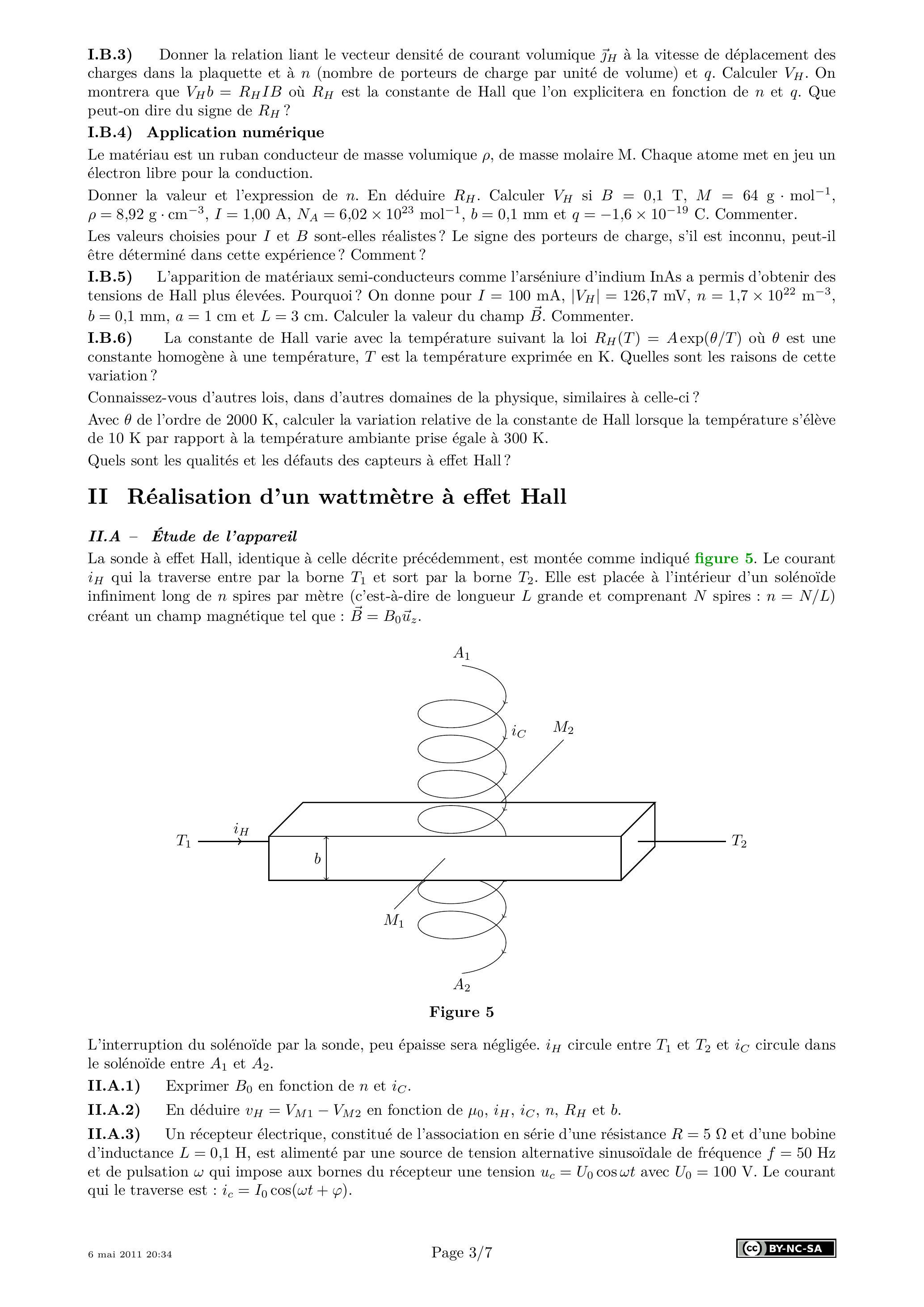 I.B.5) L'apparition de matériaux semi-conducteurs comme l'arséniure d'indium InAs a permis d'obtenir des tensions de Hall plus élevées. Pourquoi? On donne pour , et . Calculer la valeur du champ . Commenter.