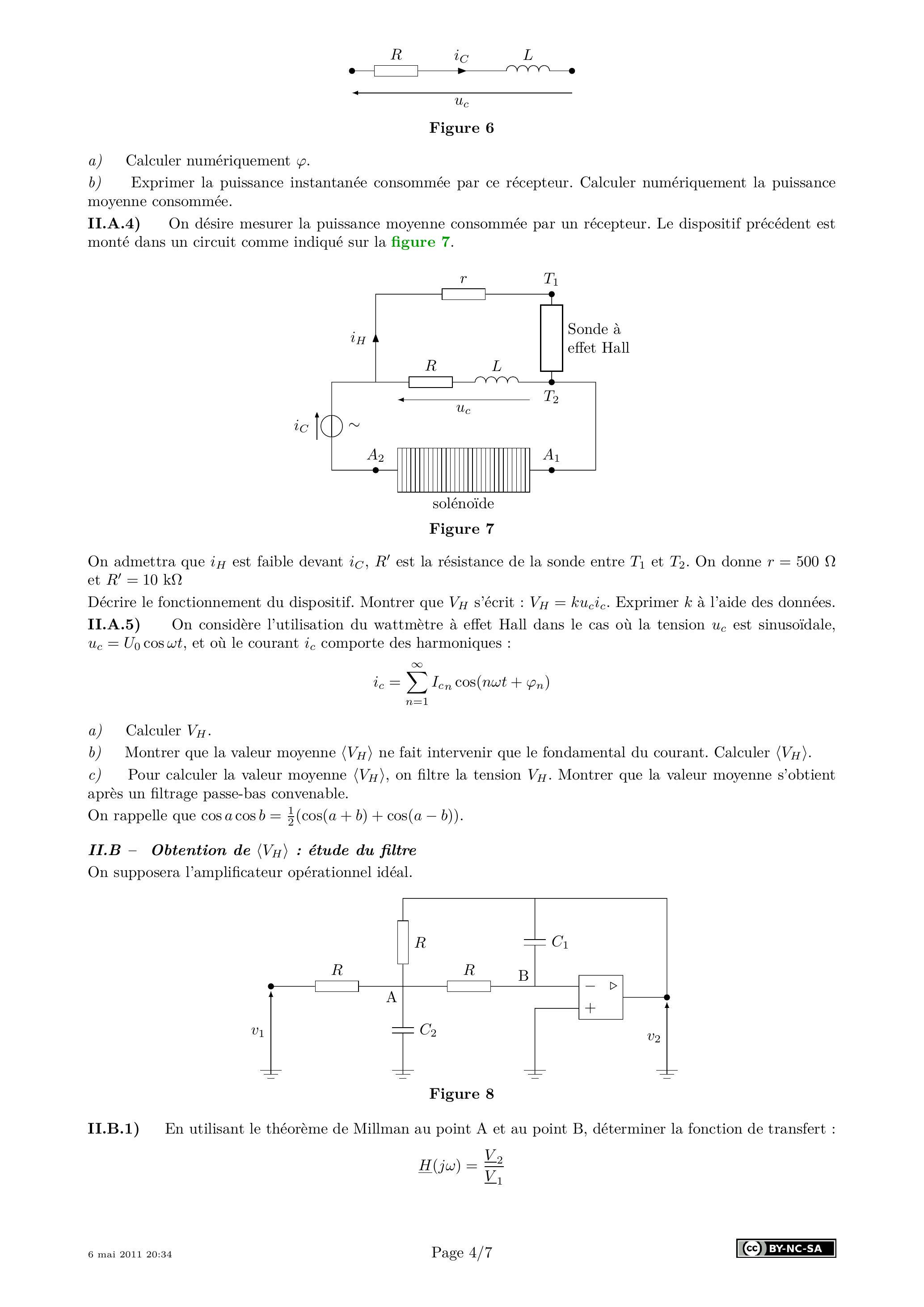 II.A.5) On considère l'utilisation du wattmètre à effet Hall dans le cas où la tension est sinusoïdale, , et où le courant comporte des harmoniques: