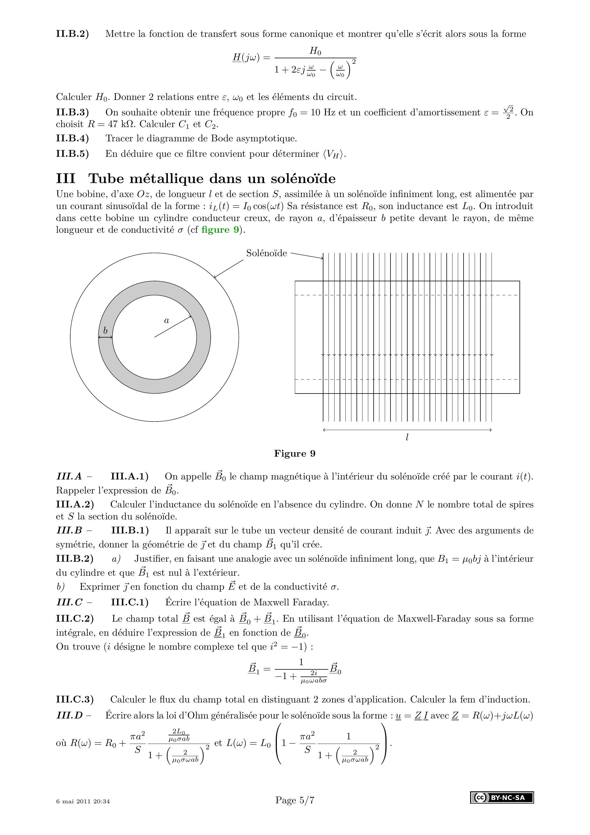 Une bobine, d'axe , de longueur et de section , assimilée à un solénoïde infiniment long, est alimentée par un courant sinusoïdal de la forme : Sa résistance est , son inductance est . On introduit dans cette bobine un cylindre conducteur creux, de rayon , d'épaisseur petite devant le rayon, de même longueur et de conductivité (cf figure 9 ).