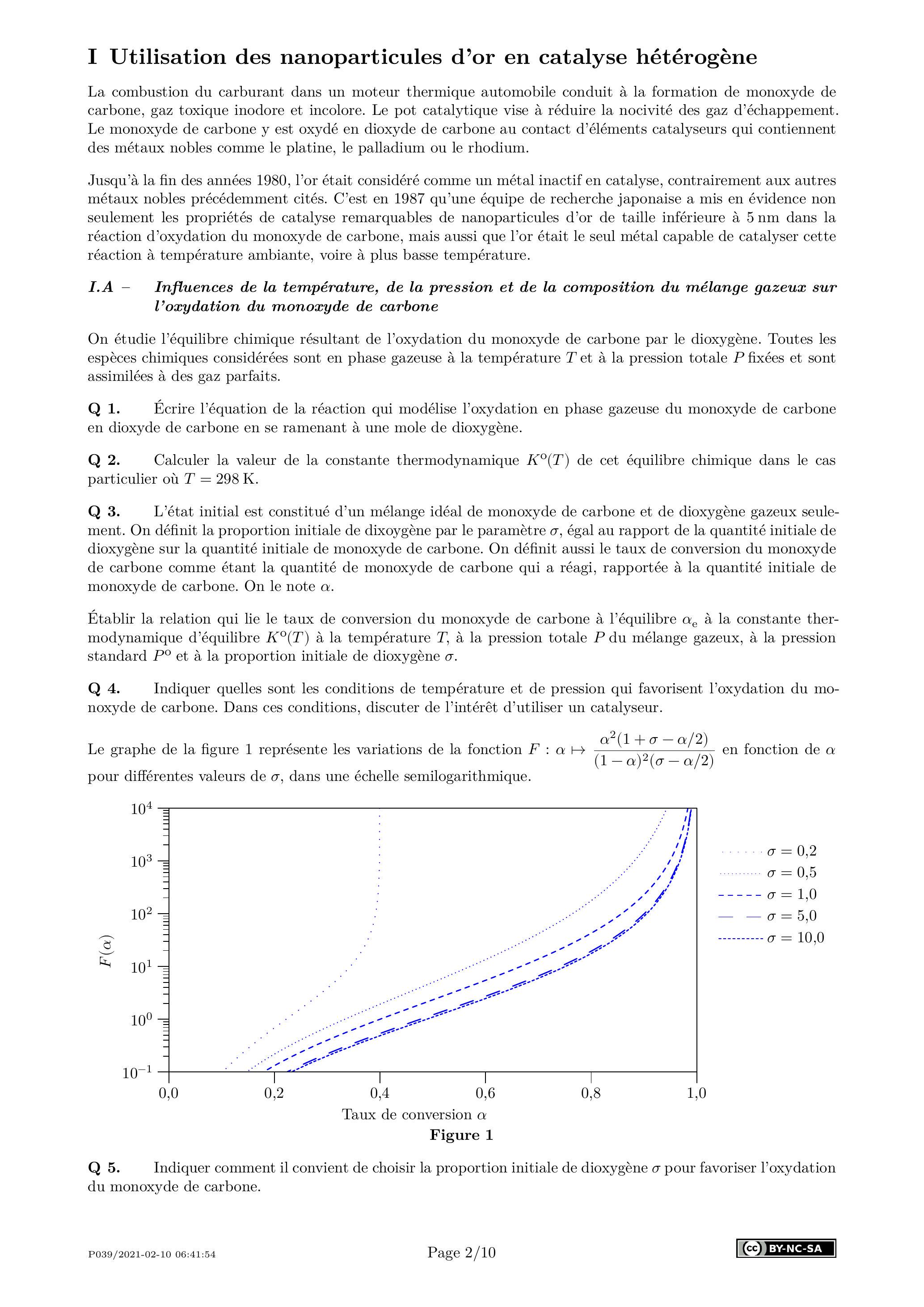 Q 3. L'état initial est constitué d'un mélange idéal de monoxyde de carbone et de dioxygène gazeux seulement. On définit la proportion initiale de dixoygène par le paramètre , égal au rapport de la quantité initiale de dioxygène sur la quantité initiale de monoxyde de carbone. On définit aussi le taux de conversion du monoxyde de carbone comme étant la quantité de monoxyde de carbone qui a réagi, rapportée à la quantité initiale de monoxyde de carbone. On le note .