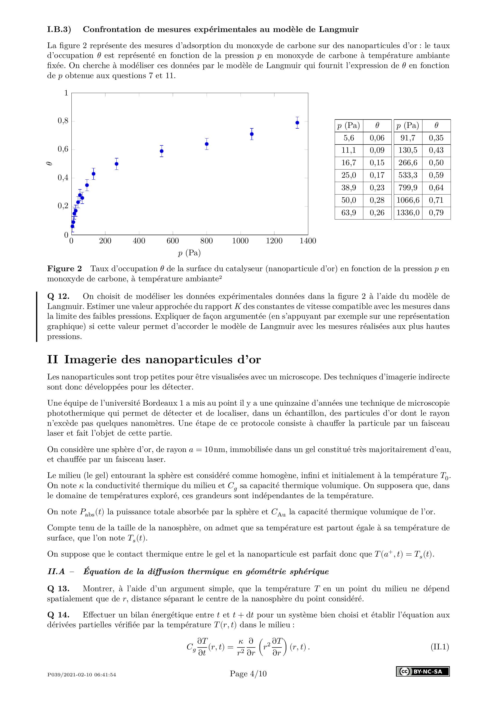 La figure 2 représente des mesures d'adsorption du monoxyde de carbone sur des nanoparticules d'or : le taux d'occupation est représenté en fonction de la pression en monoxyde de carbone à température ambiante fixée. On cherche à modéliser ces données par le modèle de Langmuir qui fournit l'expression de en fonction de obtenue aux questions 7 et 11 .