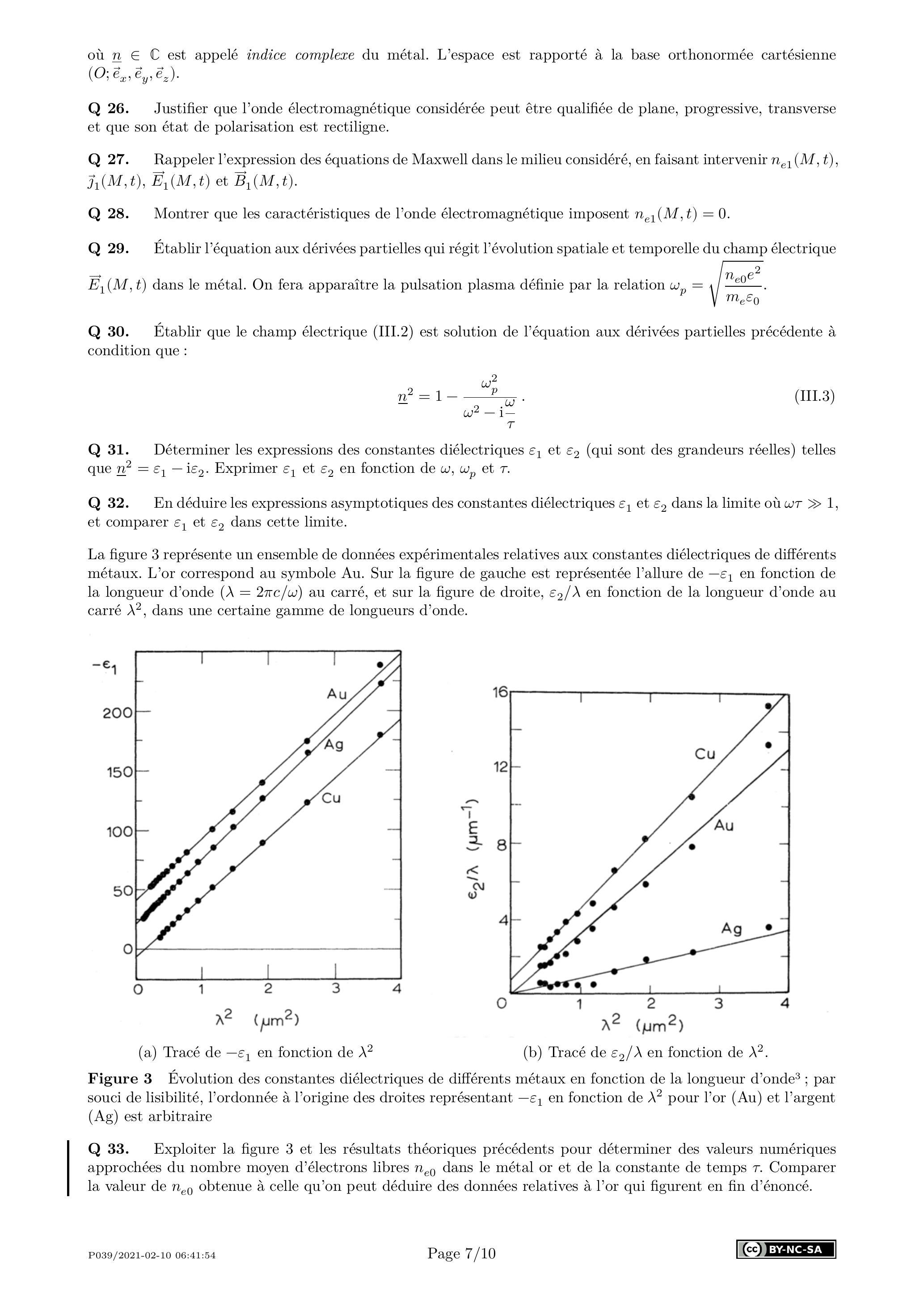 Q 31. Déterminer les expressions des constantes diélectriques et (qui sont des grandeurs réelles) telles que . Exprimer et en fonction de et .