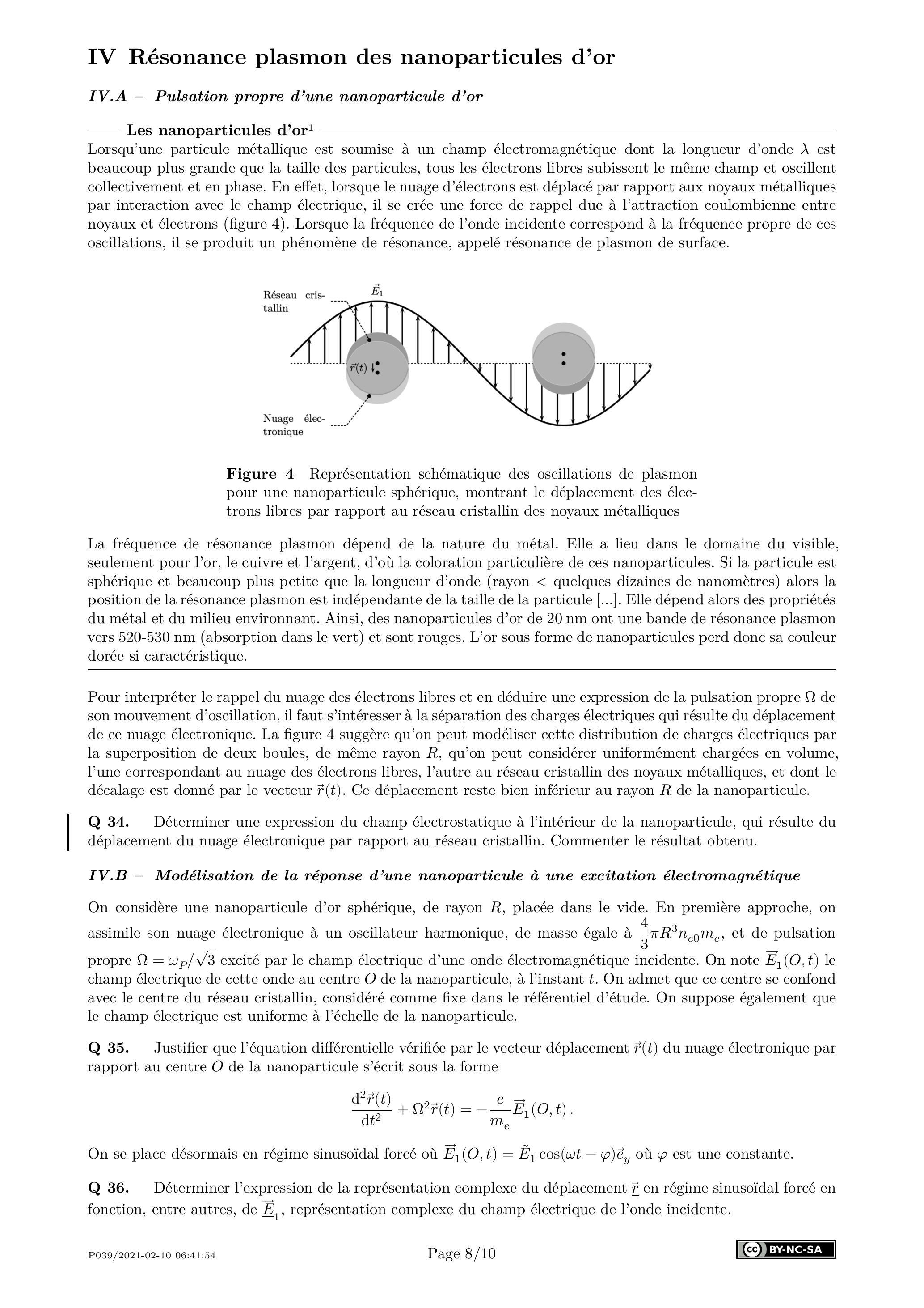 Q 35. Justifier que l'équation différentielle vérifiée par le vecteur déplacement du nuage électronique par rapport au centre de la nanoparticule s'écrit sous la forme