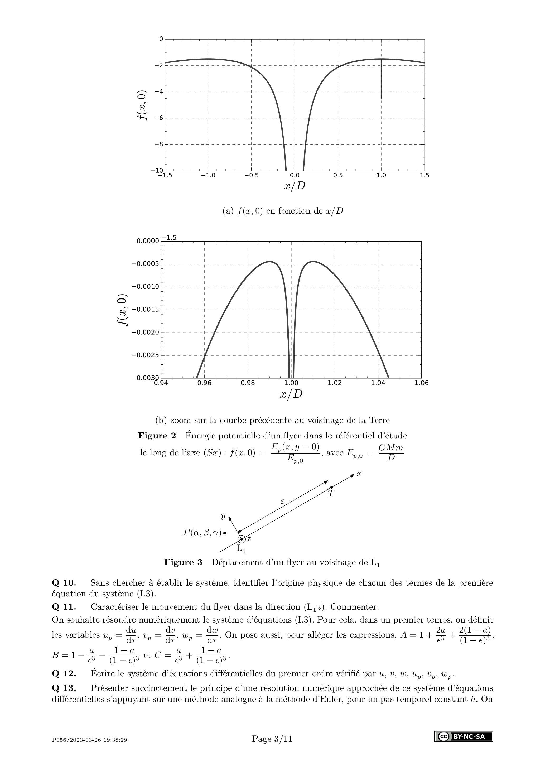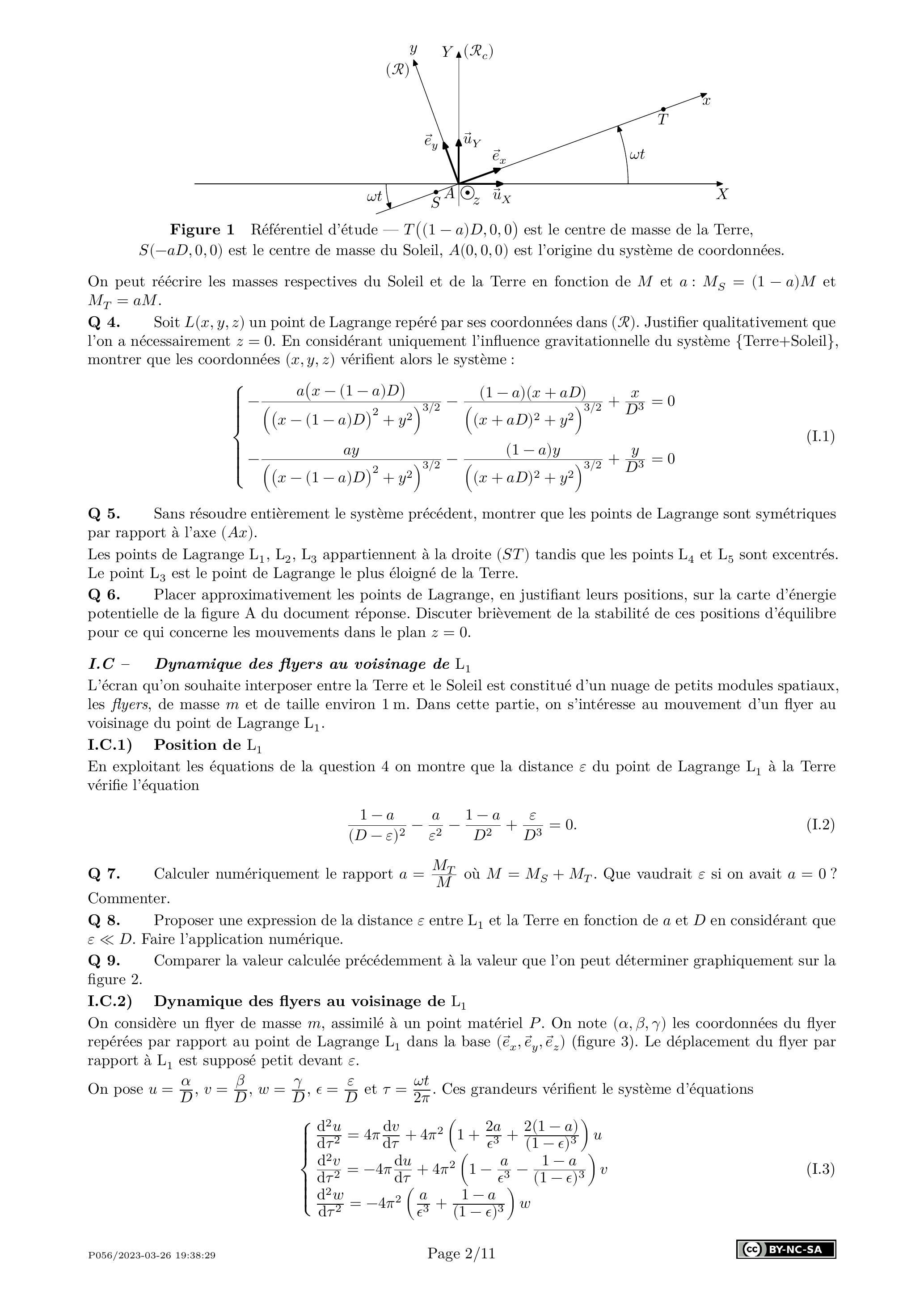 Q 4. Soit un point de Lagrange repéré par ses coordonnées dans . Justifier qualitativement que l'on a nécessairement . En considérant uniquement l'influence gravitationnelle du système {Terre+Soleil}, montrer que les coordonnées ( ) vérifient alors le système: