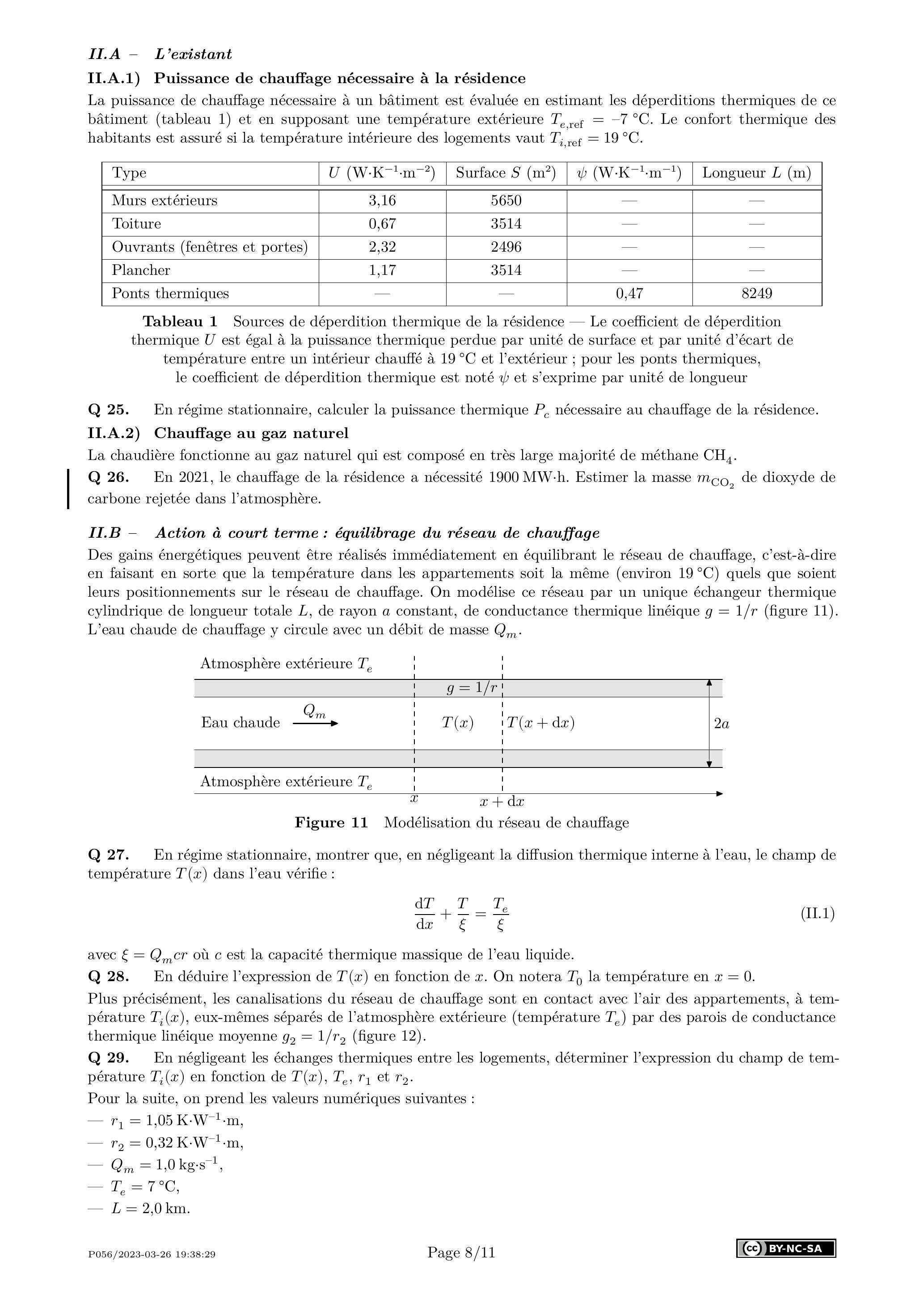 La puissance de chauffage nécessaire à un bâtiment est évaluée en estimant les déperditions thermiques de ce bâtiment (tableau 1) et en supposant une température extérieure . Le confort thermique des habitants est assuré si la température intérieure des logements vaut .