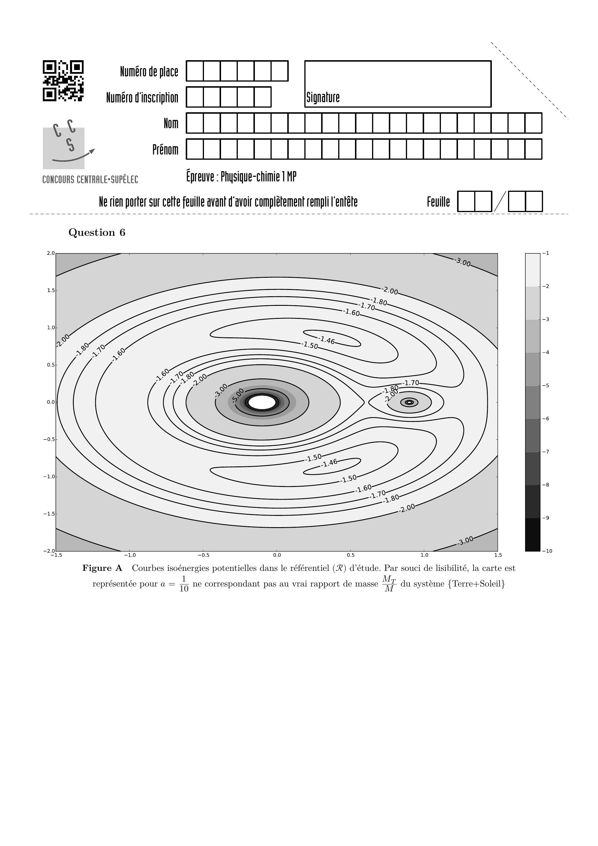 Q 6. Placer approximativement les points de Lagrange, en justifiant leurs positions, sur la carte d'énergie potentielle de la figure A du document réponse. Discuter brièvement de la stabilité de ces positions d'équilibre pour ce qui concerne les mouvements dans le plan .