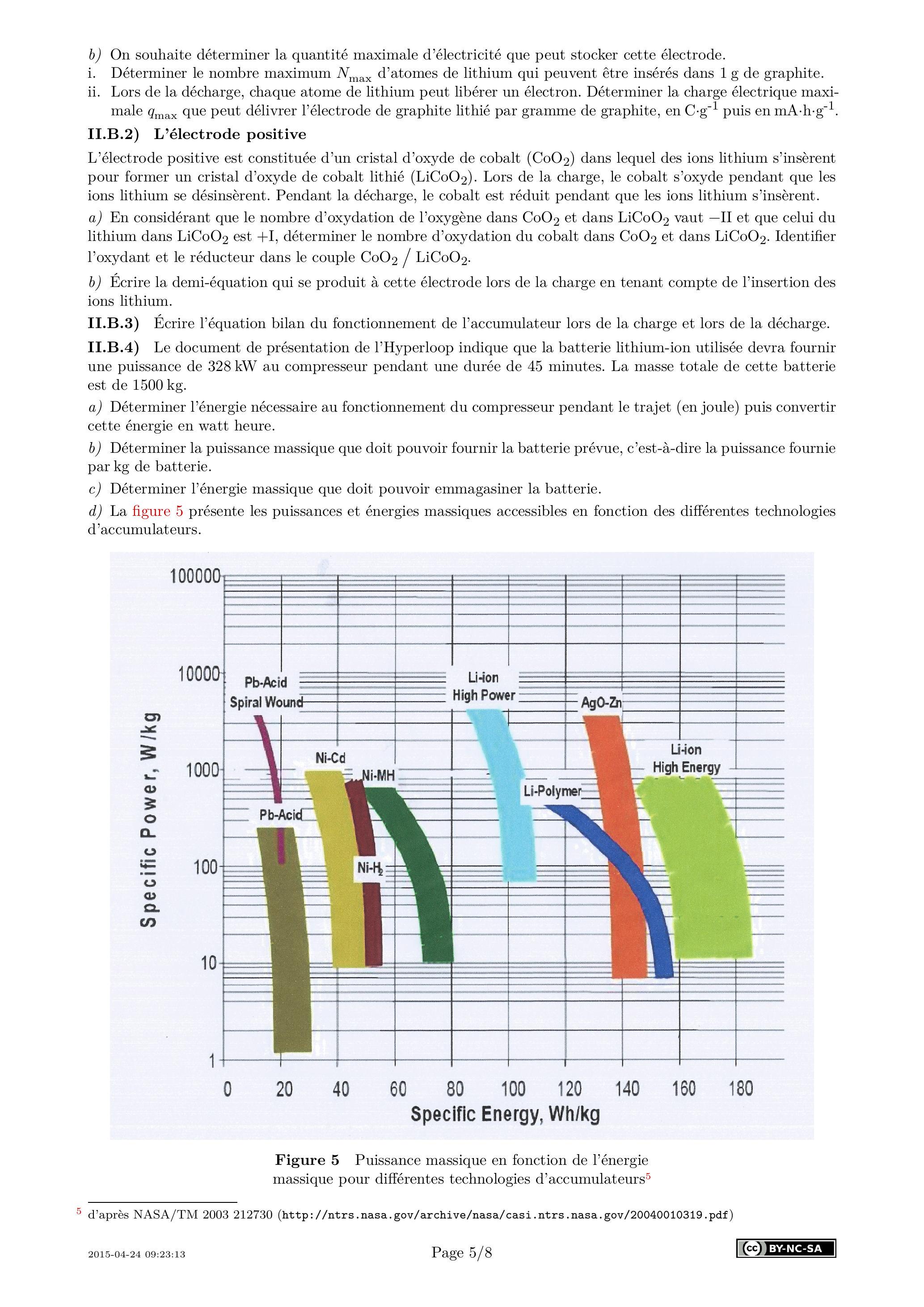 II.B.4) Le document de présentation de l'Hyperloop indique que la batterie lithium-ion utilisée devra fournir une puissance de 328 kW au compresseur pendant une durée de 45 minutes. La masse totale de cette batterie est de 1500 kg .