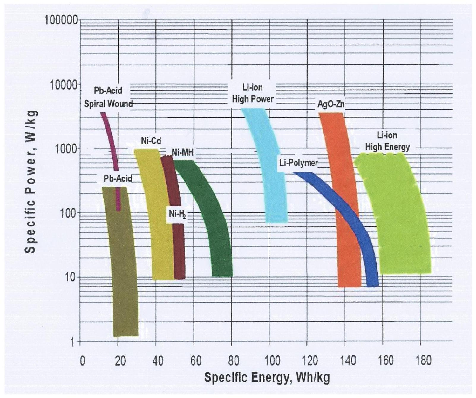Figure 5 Puissance massique en fonction de l'énergie massique pour différentes technologies d'accumulateurs