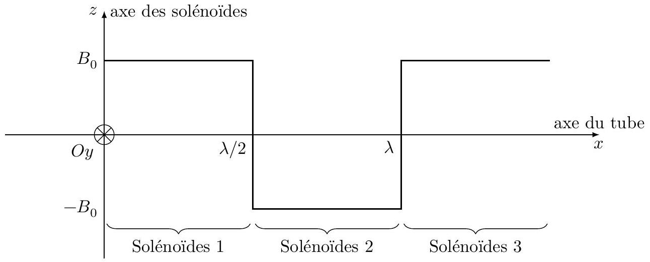 III.A.2) Pour produire le champ statorique, on dispose régulièrement le long du tube des paires de solénoïdes en inversant le sens du courant à chaque changement de paires de solénoïdes. Ce dispositif permet de créer un champ magnétique dirigé selon dont la représentation graphique est donnée figure 6 .