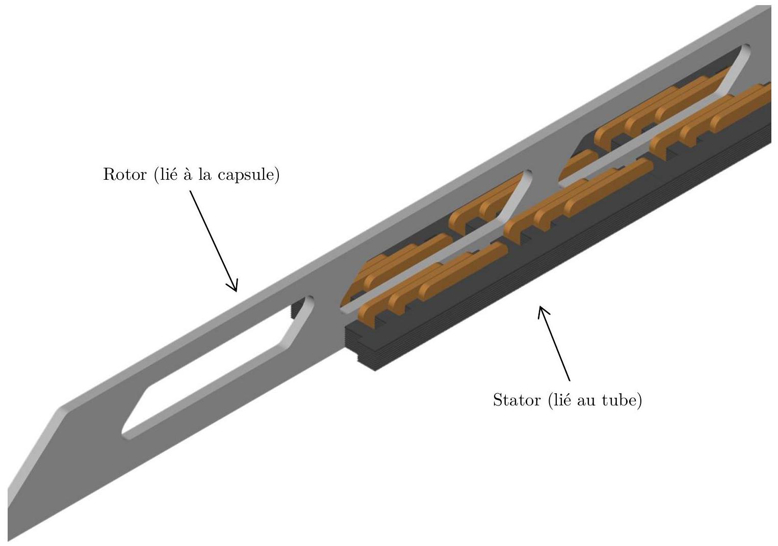 Il est prévu d'assurer les accélérations et freinages de la capsule par un moteur linéaire à induction. Ce moteur est constitué d'un stator, fixe par rapport au tube et produisant un champ magnétique variable et d'une partie mobile, appelée «rotor», solidaire de la capsule (cf figure 7). Dans ce moteur, le «rotor» ne suit pas un mouvement de rotation, mais un mouvement de translation dans la direction du tube.
