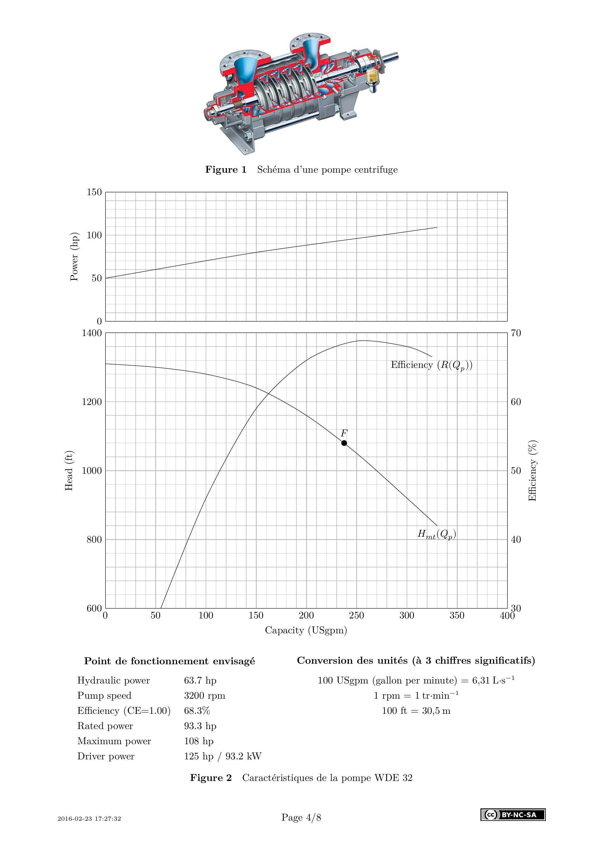 Une pompe centrifuge est caractérisée a minima par trois paramètres : son débit volumique nominal , sa hauteur manométrique totale nominale qui est la variation de hauteur manométrique engendrée par la pompe (usuellement exprimée en mètre de colonne d'eau: mCE ) et son rendement hydraulique nominal où est la puissance hydraulique fournie par la pompe et la puissance mécanique fournie à la pompe. Le constructeur fournit les courbes et . On dispose (figure 2) de la caractéristique hydraulique du type de pompe retenue (WDE 32). Il s'agit d'une pompe centrifuge multi-étages dont le fonctionnement ne sera pas étudié ici.