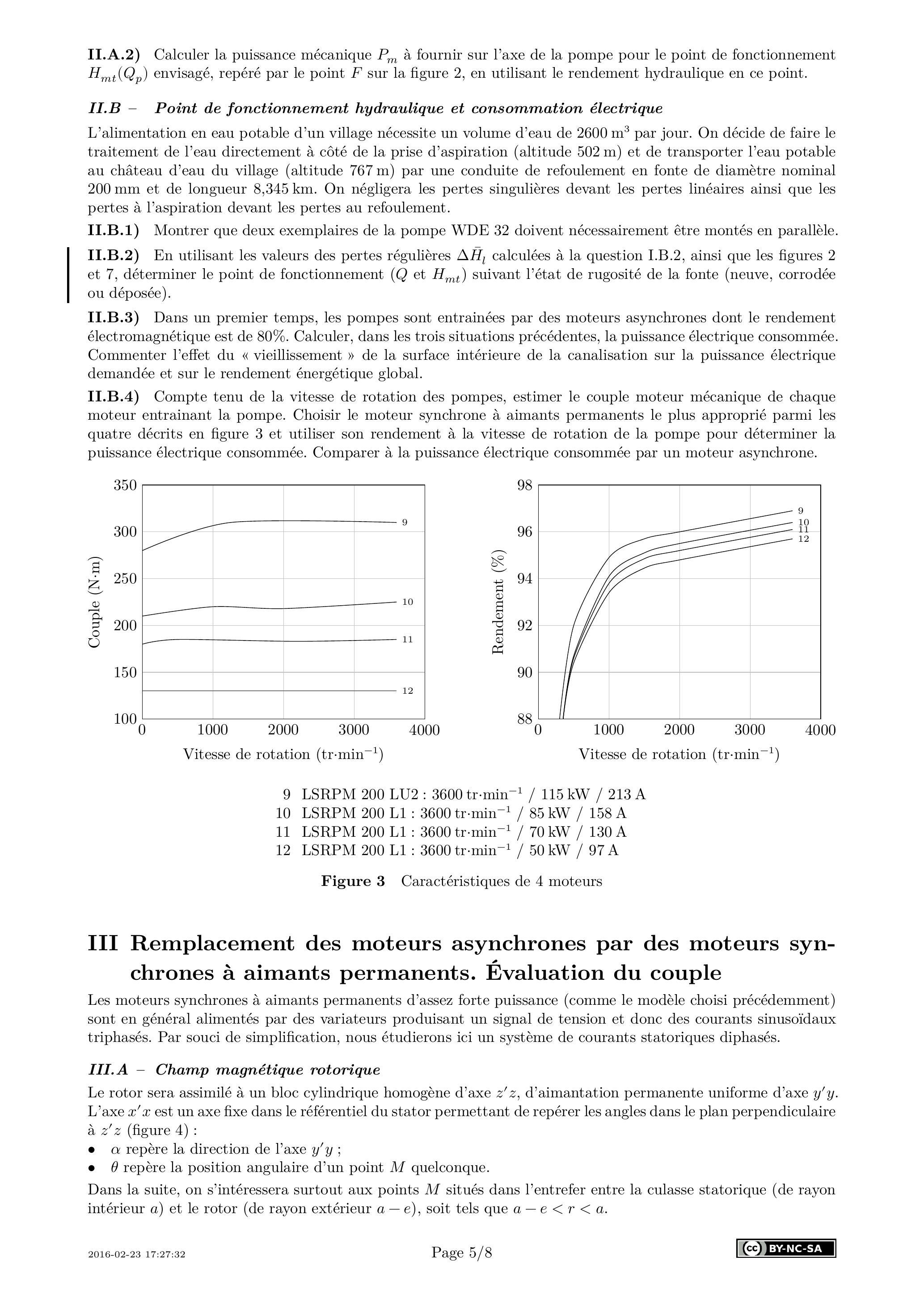 II.B.4) Compte tenu de la vitesse de rotation des pompes, estimer le couple moteur mécanique de chaque moteur entrainant la pompe. Choisir le moteur synchrone à aimants permanents le plus approprié parmi les quatre décrits en figure 3 et utiliser son rendement à la vitesse de rotation de la pompe pour déterminer la puissance électrique consommée. Comparer à la puissance électrique consommée par un moteur asynchrone.