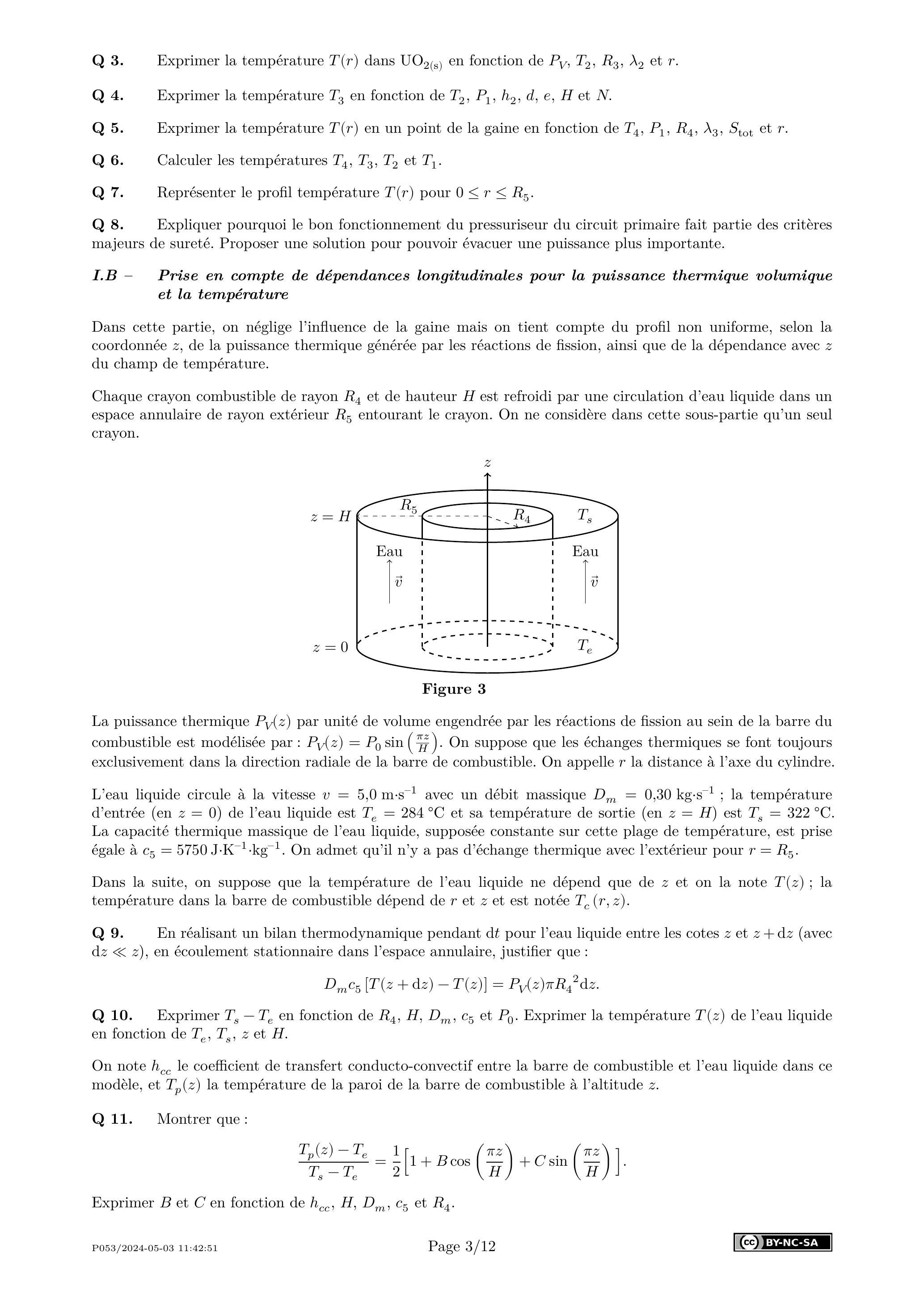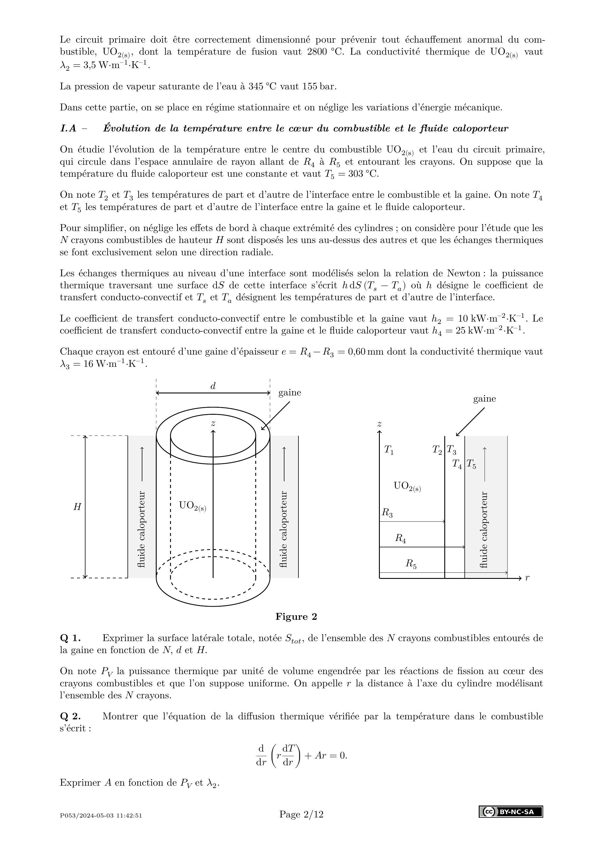 La puissance thermique par unité de volume engendrée par les réactions de fission au sein de la barre du combustible est modélisée par : . On suppose que les échanges thermiques se font toujours exclusivement dans la direction radiale de la barre de combustible. On appelle la distance à l'axe du cylindre.