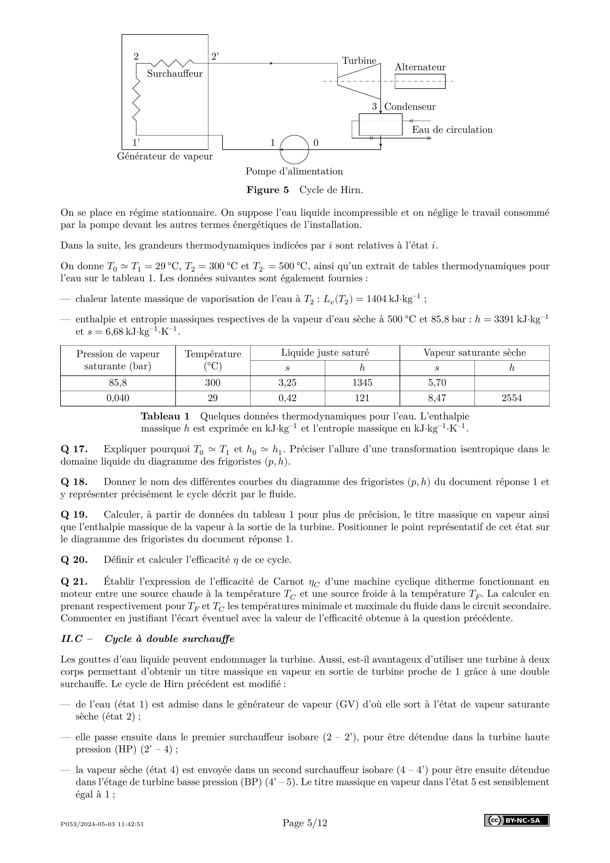 enthalpie et entropie massiques respectives de la vapeur d'eau sèche à et 85,8 bar : et .