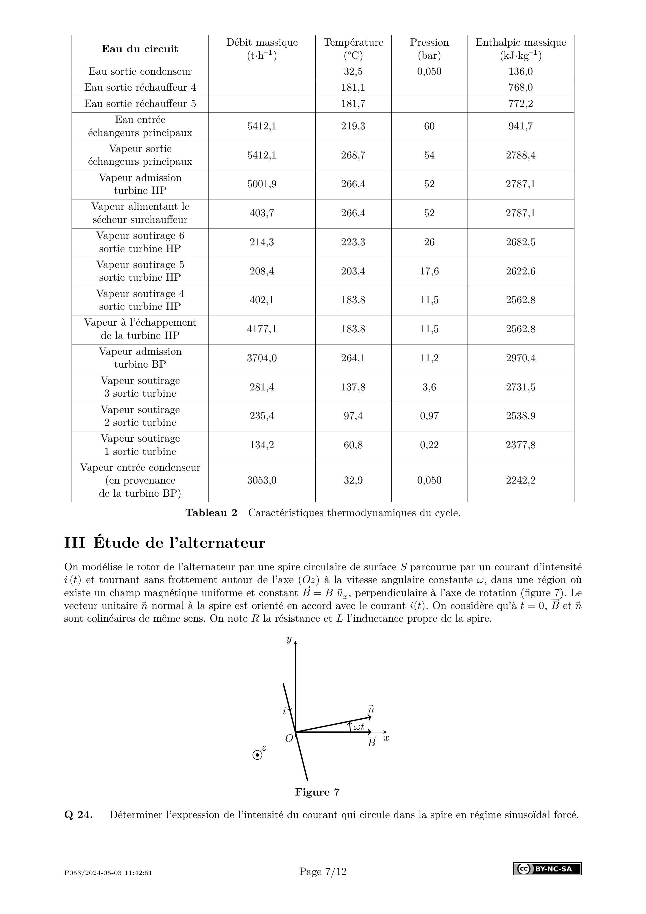 Q 23. Calculer l'efficacité du cycle en vous appuyant notamment sur les caractéristiques thermodynamiques du cycle fournies dans le tableau 2. En déduire la puissance disponible aux bornes de l'alternateur. En réalité, cette puissance disponible n'est que de 960 MW : proposer une explication.