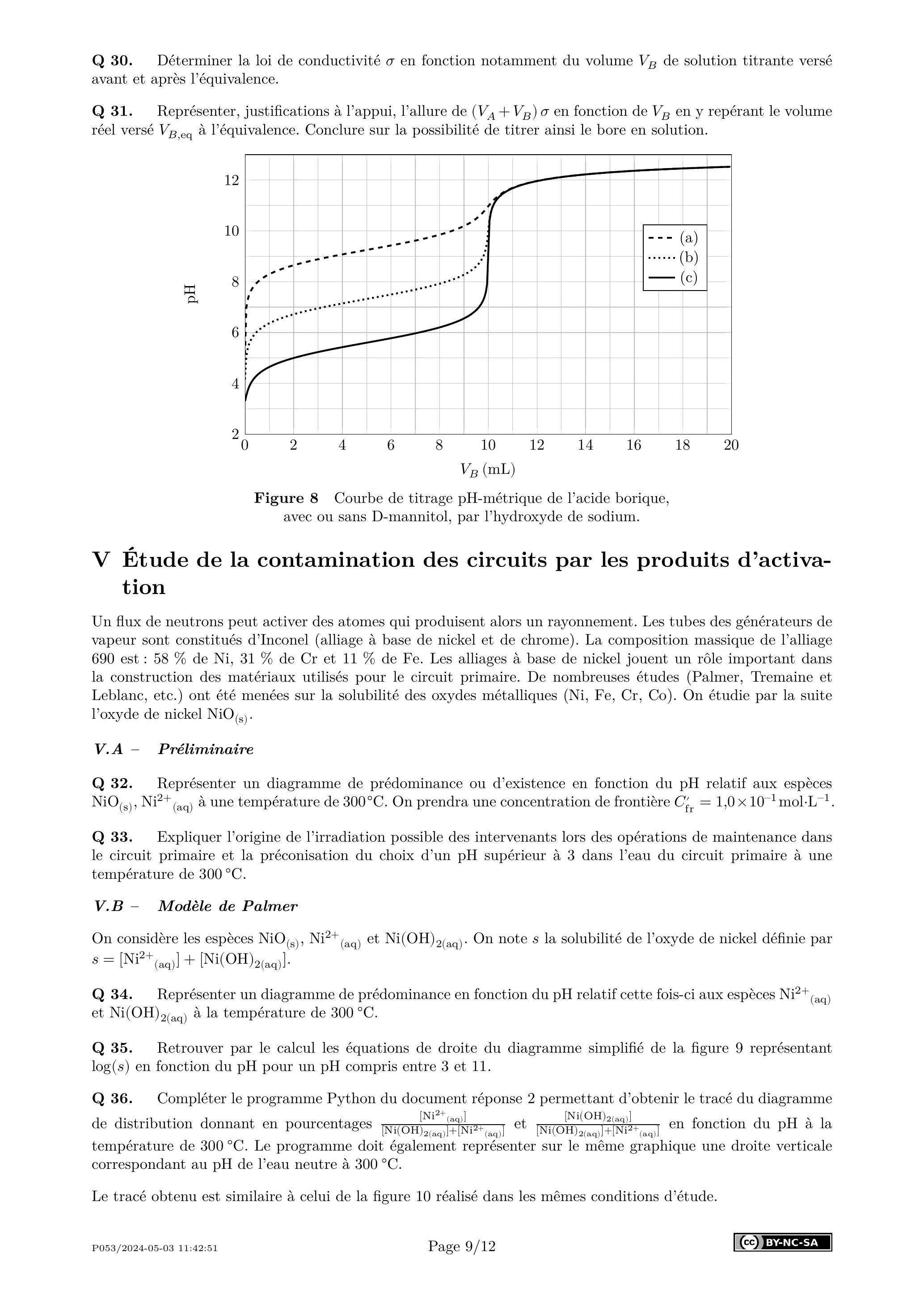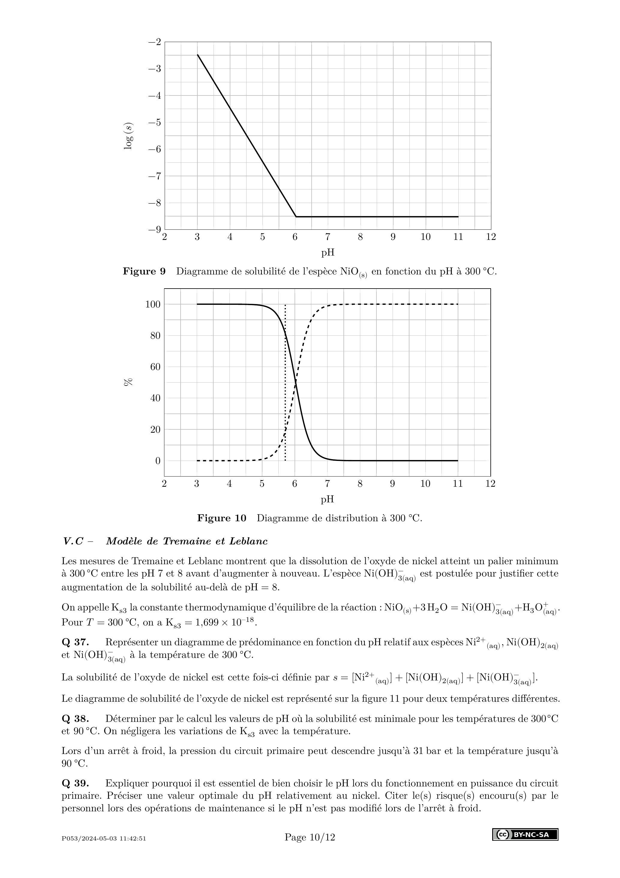 Q 39. Expliquer pourquoi il est essentiel de bien choisir le pH lors du fonctionnement en puissance du circuit primaire. Préciser une valeur optimale du pH relativement au nickel. Citer le(s) risque(s) encouru(s) par le personnel lors des opérations de maintenance si le pH n'est pas modifié lors de l'arrêt à froid.
