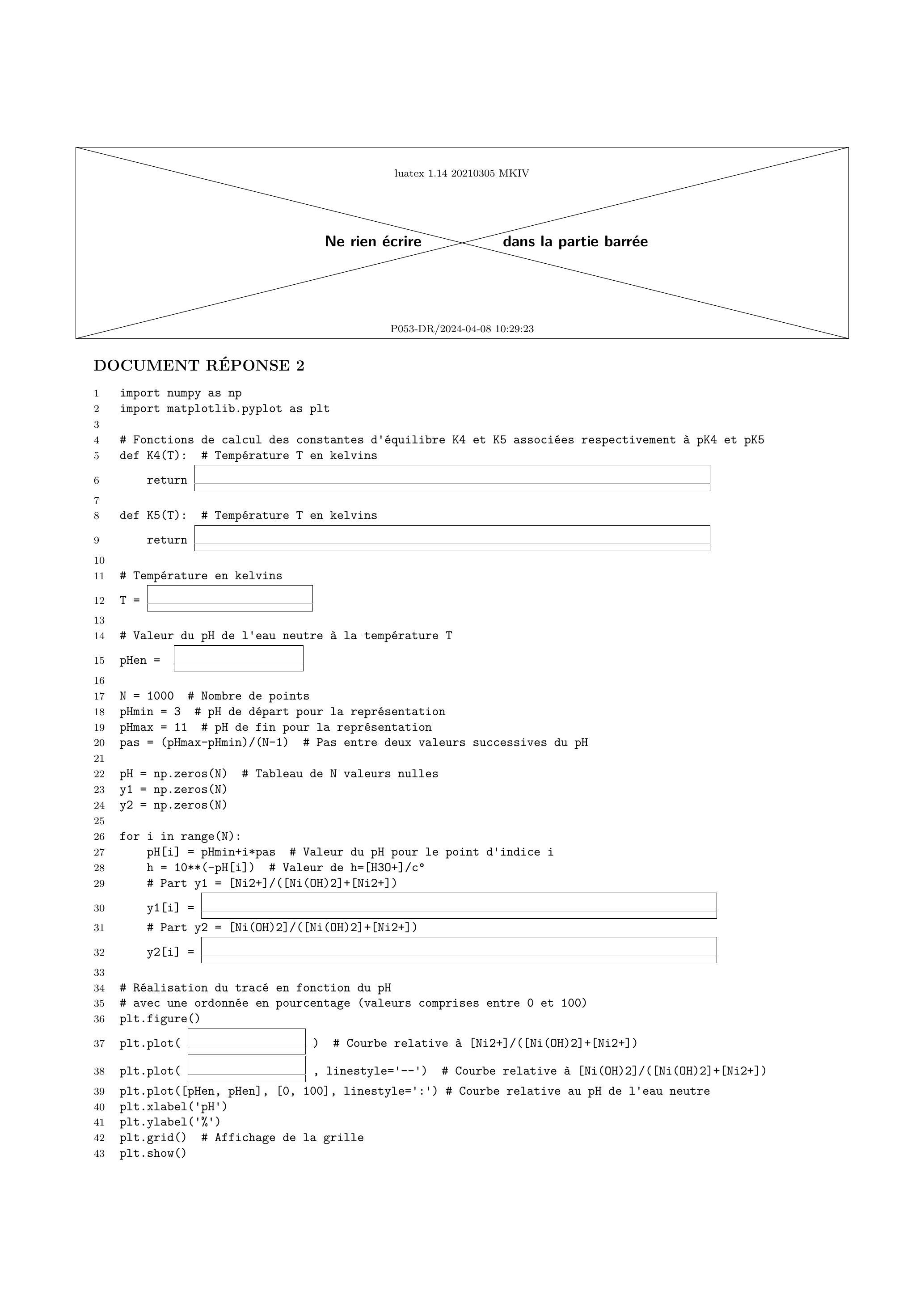 Q 36. Compléter le programme Python du document réponse 2 permettant d'obtenir le tracé du diagramme de distribution donnant en pourcentages et en fonction du pH à la température de . Le programme doit également représenter sur le même graphique une droite verticale correspondant au pH de l'eau neutre à .