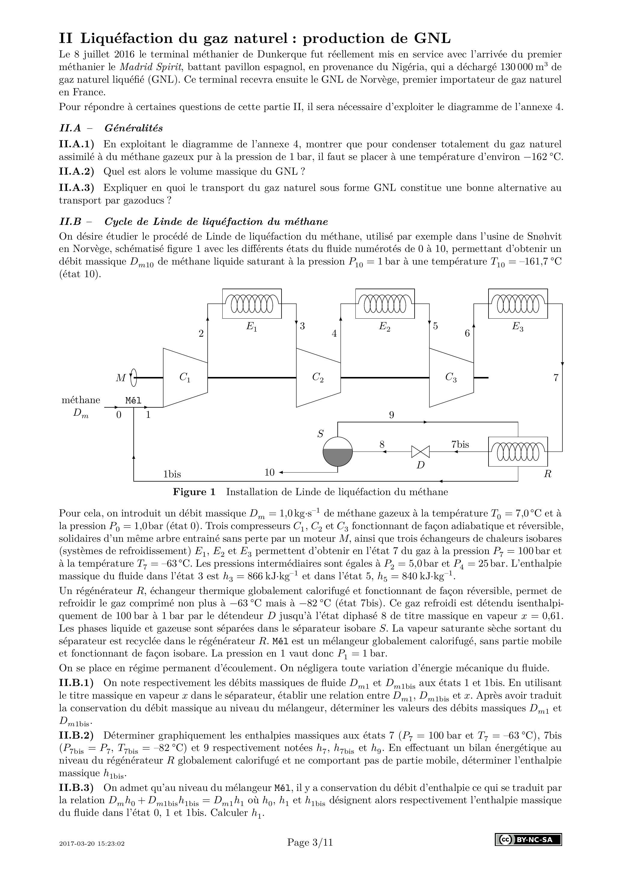 Pour cela, on introduit un débit massique de méthane gazeux à la température et à la pression (état 0 ). Trois compresseurs et fonctionnant de façon adiabatique et réversible, solidaires d'un même arbre entrainé sans perte par un moteur , ainsi que trois échangeurs de chaleurs isobares (systèmes de refroidissement) et permettent d'obtenir en l'état 7 du gaz à la pression bar et à la température . Les pressions intermédiaires sont égales à bar et bar. L'enthalpie massique du fluide dans l'état 3 est et dans l'état .