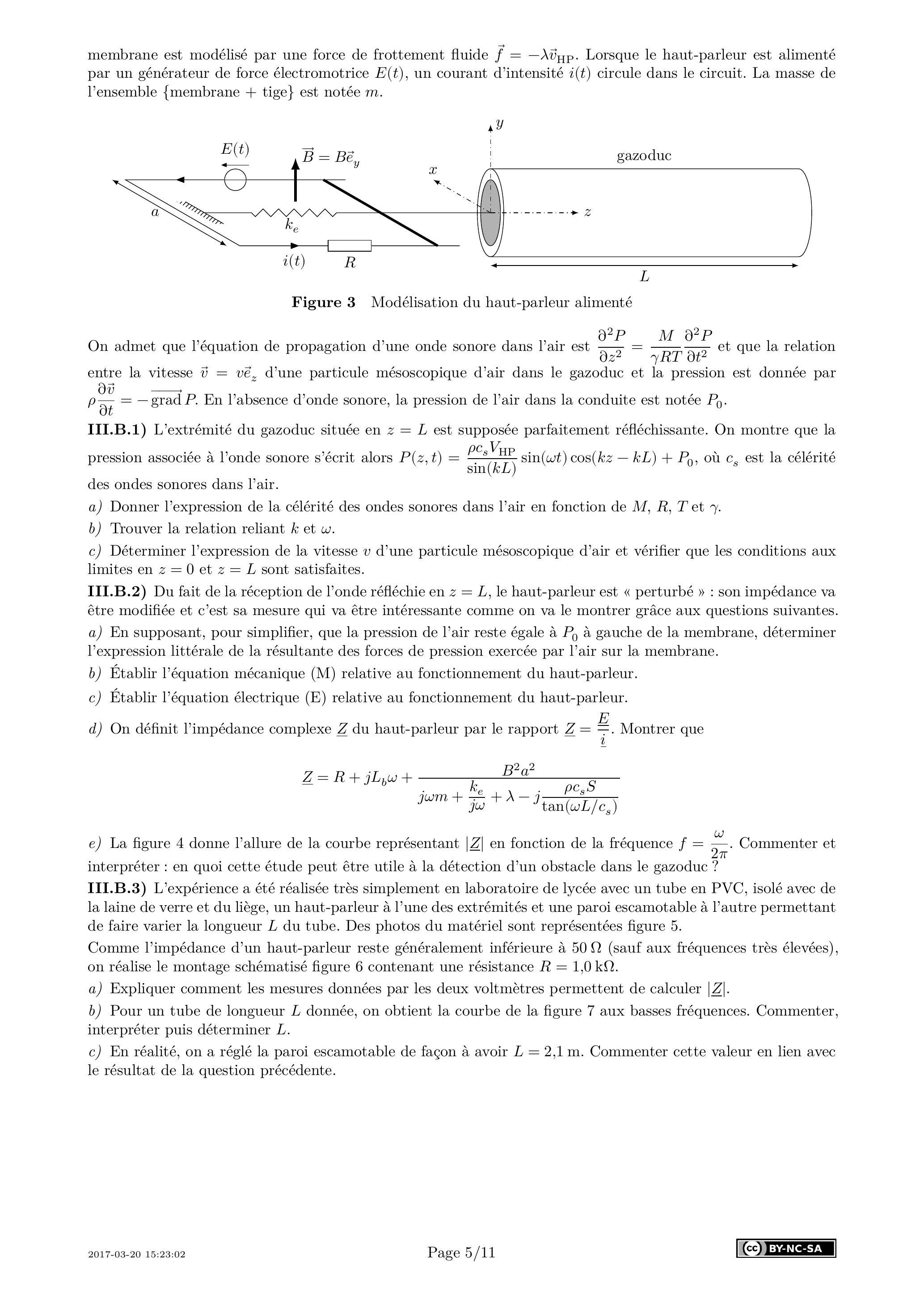 On modélise le dispositif comme indiqué figure 3. La membrane du haut-parleur, assimilée à un disque d'aire , est reliée élastiquement au bâti par un ressort de rappel de constante de raideur exerçant une force sur la membrane lorsqu'elle est située en . La membrane est solidaire d'une tige métallique de longueur pouvant évoluer sans frottement en translation rectiligne parallèlement à ( ) sur deux rails métalliques. L'ensemble baigne dans un champ magnétostatique uniforme et stationnaire . L'inductance du circuit est , sa résistance est . En dehors de l'action des forces de pression, l'amortissement de la