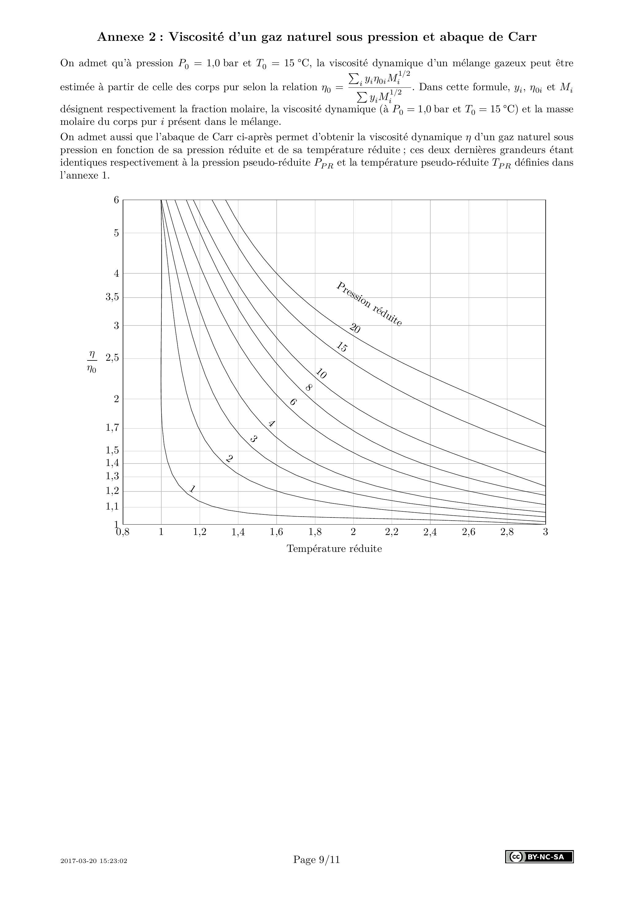 En utilisant les annexes 1 et 2 , montrer, en explicitant la démarche, que la viscosité du gaz naturel à la température de et sous une pression de l'ordre de 90 bar est environ égale à . Estimer alors le nombre de Reynolds (présenté en annexe 3) relatif à l'écoulement et montrer que la pression du gaz en sortie de la première canalisation au niveau de la station de Pitgam est de l'ordre de 93 bar. Quelle est alors la perte de charge linéique dans cette canalisation ?
