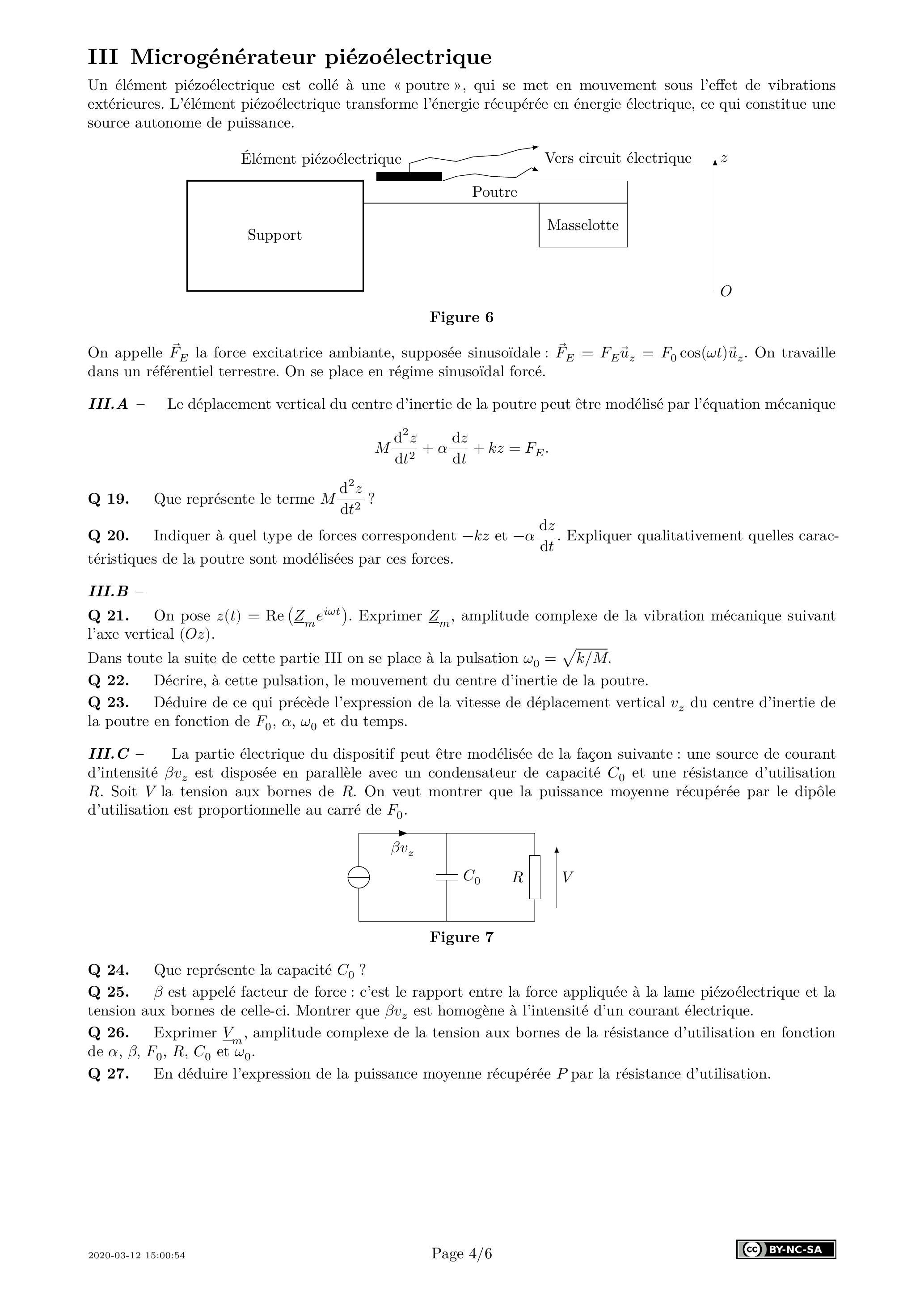 Q 25. est appelé facteur de force : c'est le rapport entre la force appliquée à la lame piézoélectrique et la tension aux bornes de celle-ci. Montrer que est homogène à l'intensité d'un courant électrique.