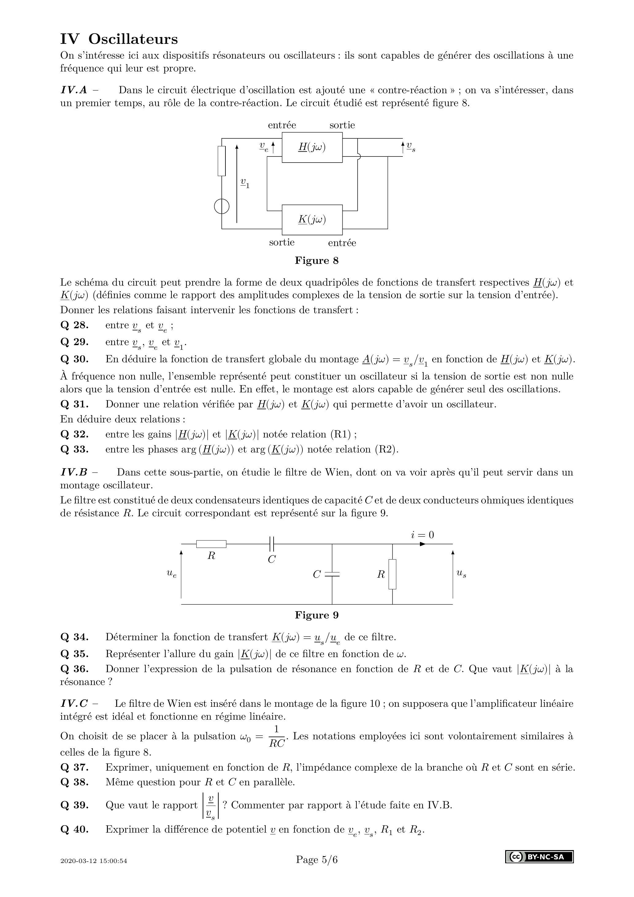 Q 30. En déduire la fonction de transfert globale du montage en fonction de et . À fréquence non nulle, l'ensemble représenté peut constituer un oscillateur si la tension de sortie est non nulle alors que la tension d'entrée est nulle. En effet, le montage est alors capable de générer seul des oscillations.