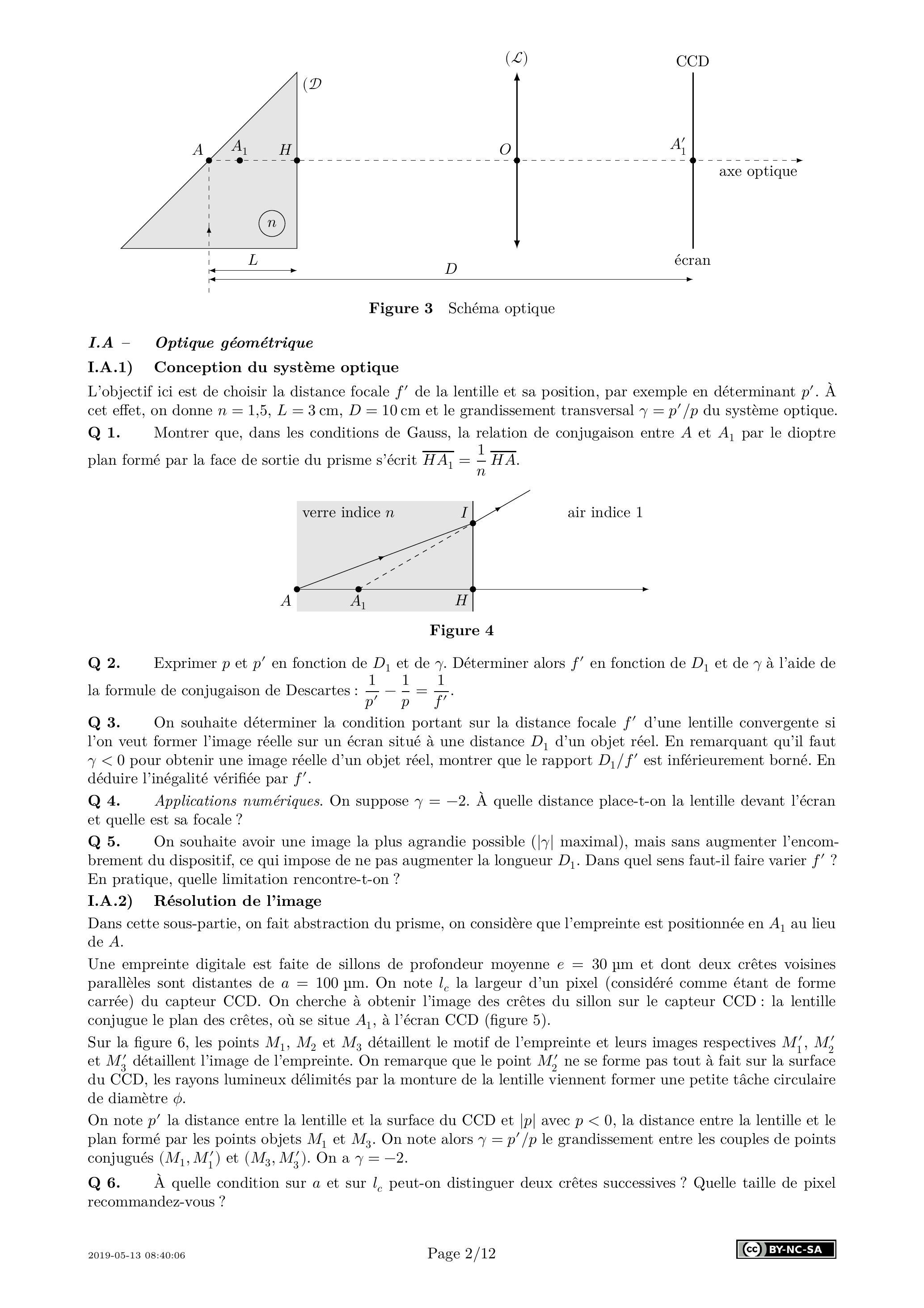 Une empreinte digitale est faite de sillons de profondeur moyenne et dont deux crêtes voisines parallèles sont distantes de . On note la largeur d'un pixel (considéré comme étant de forme carrée) du capteur CCD . On cherche à obtenir l'image des crêtes du sillon sur le capteur CCD : la lentille conjugue le plan des crêtes, où se situe , à l'écran CCD (figure 5).
